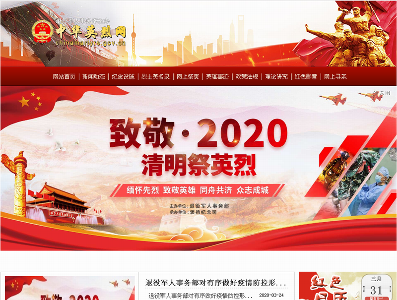 退役军人事务部将于2020年2月10日至4月10日在部网站和中华英烈网同时开设"2020·清明祭英烈"专栏,鼓励烈士亲属和社会各界通过网络向英烈寄托哀思、致敬缅怀。