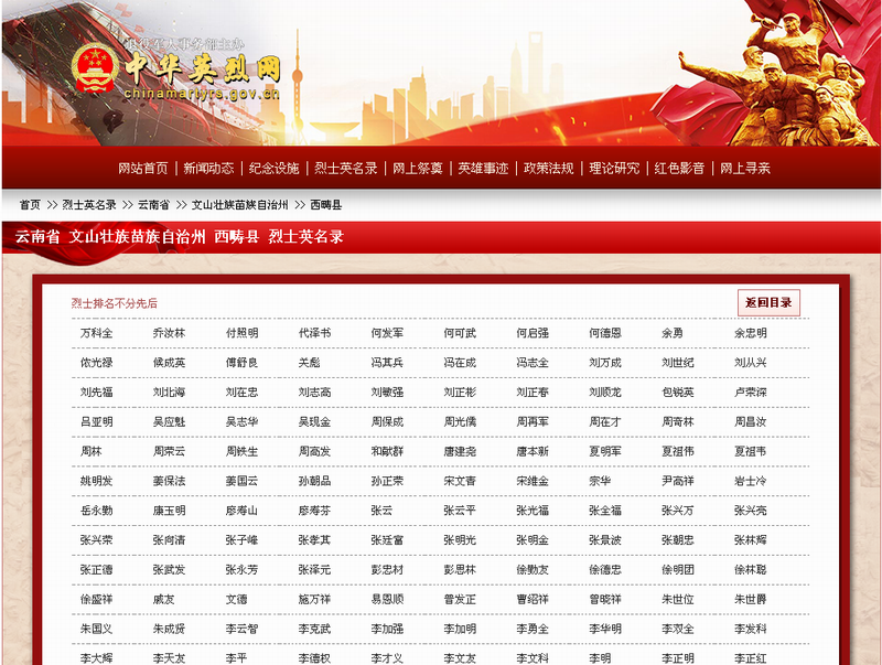 第二步:从标题行点击"烈士英名录"选择云南省文山州西畴县;