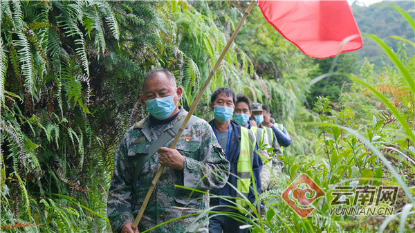 马关县罗家坪村共产党员熊光泽(前一)与同伴在边境线开展巡逻。