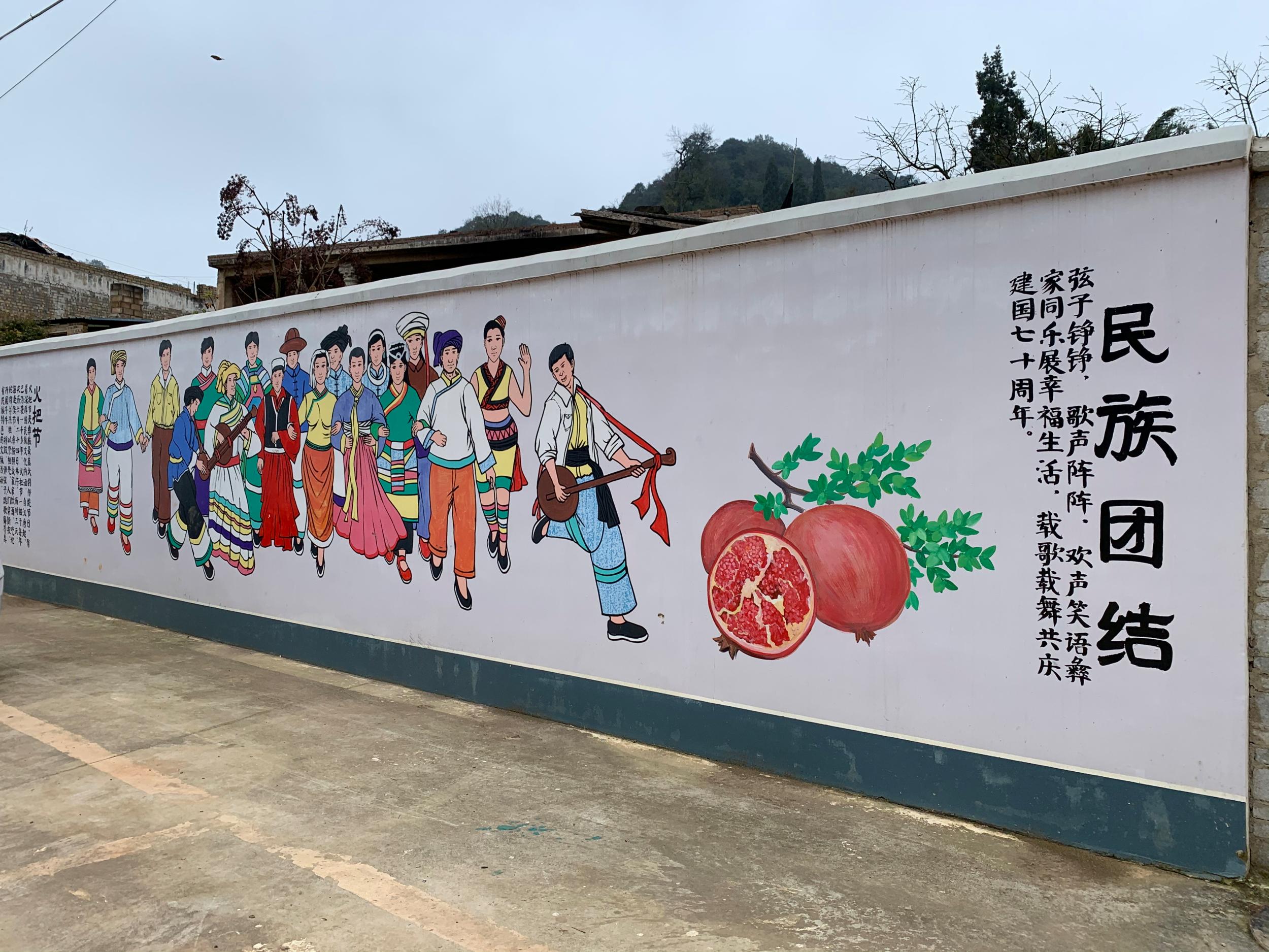 现在村里清秀了,卫生方面也好,那些墙画也好看,都是我们彝族的那些图像。