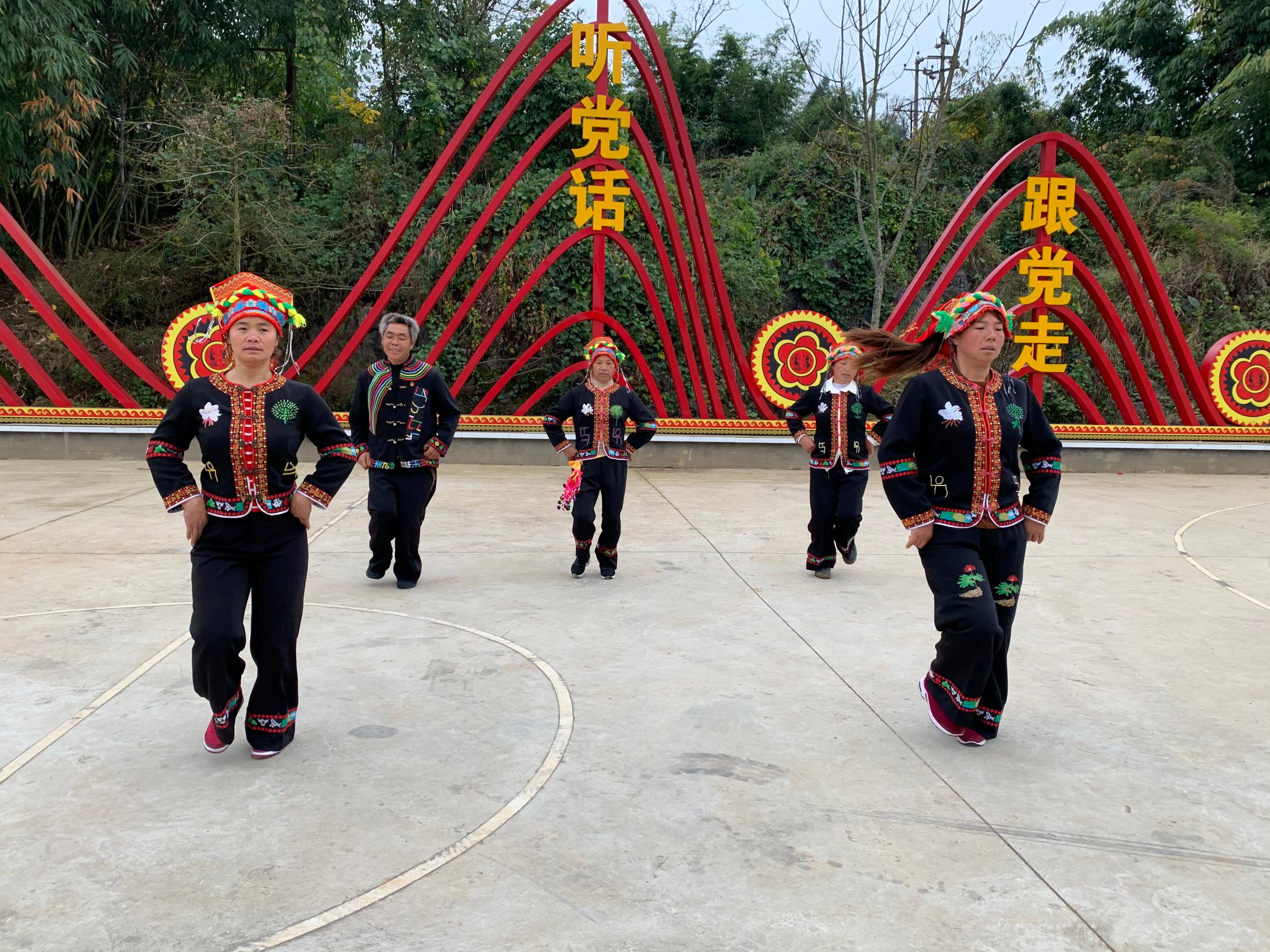 在合掌村的文化广场上,合掌村倮语培训班的成员们正在排练彝族民俗改编的舞蹈。为了传承民族文化,合掌村党委先后组织各支部党员深入挖掘学习彝族尼苏·阿扎在合掌村发展演变壮大的深厚历史。2017的6月,合掌村倮语文化培训班正式开班,目前已发展成员65人。