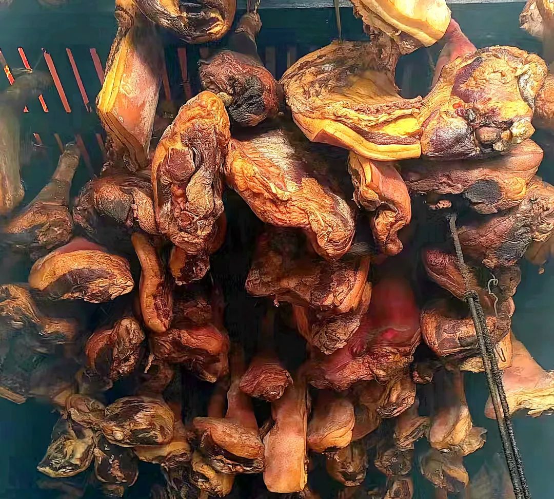 家乡的年味,是腊味。将新鲜的猪肉腌好了,穿绳凉干水分,便挂上火塘炕梁上熏制了,俗称“腊肉”。为了熏出火候和香味,多烧一些松枝、稻草、锯末、细糠,伴着日子的烟熏火燎,炕上的腊肉在人间烟火之中,熏得金黄流油,腊香味渗透进肉的肌理深处,特别惹人垂涎。
