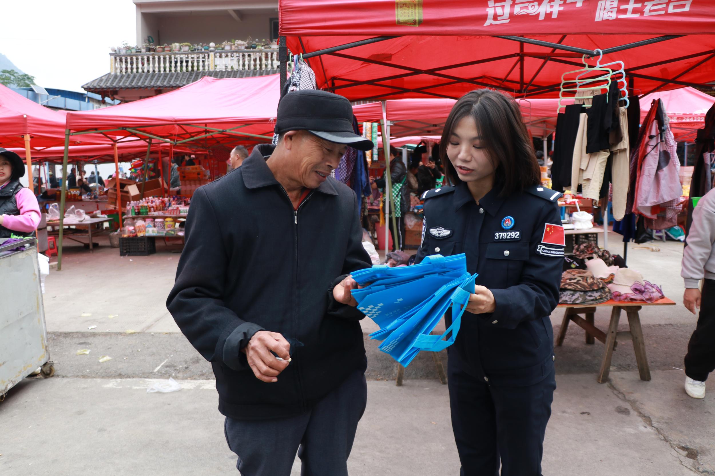 集市里人头攒动,坡脚站宣传民警抓住人流量大的时机,悬挂横幅、发放资料。民警结合生动典型案例,向商户和群众解析危害国家安全违法犯罪的手段。