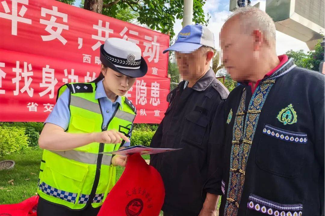 近日,西畴县公安局交管大队以“人人讲安全 个个会应急——查找身边的安全隐患”为主题,在辖区北回广场开展交通安全宣传活动。