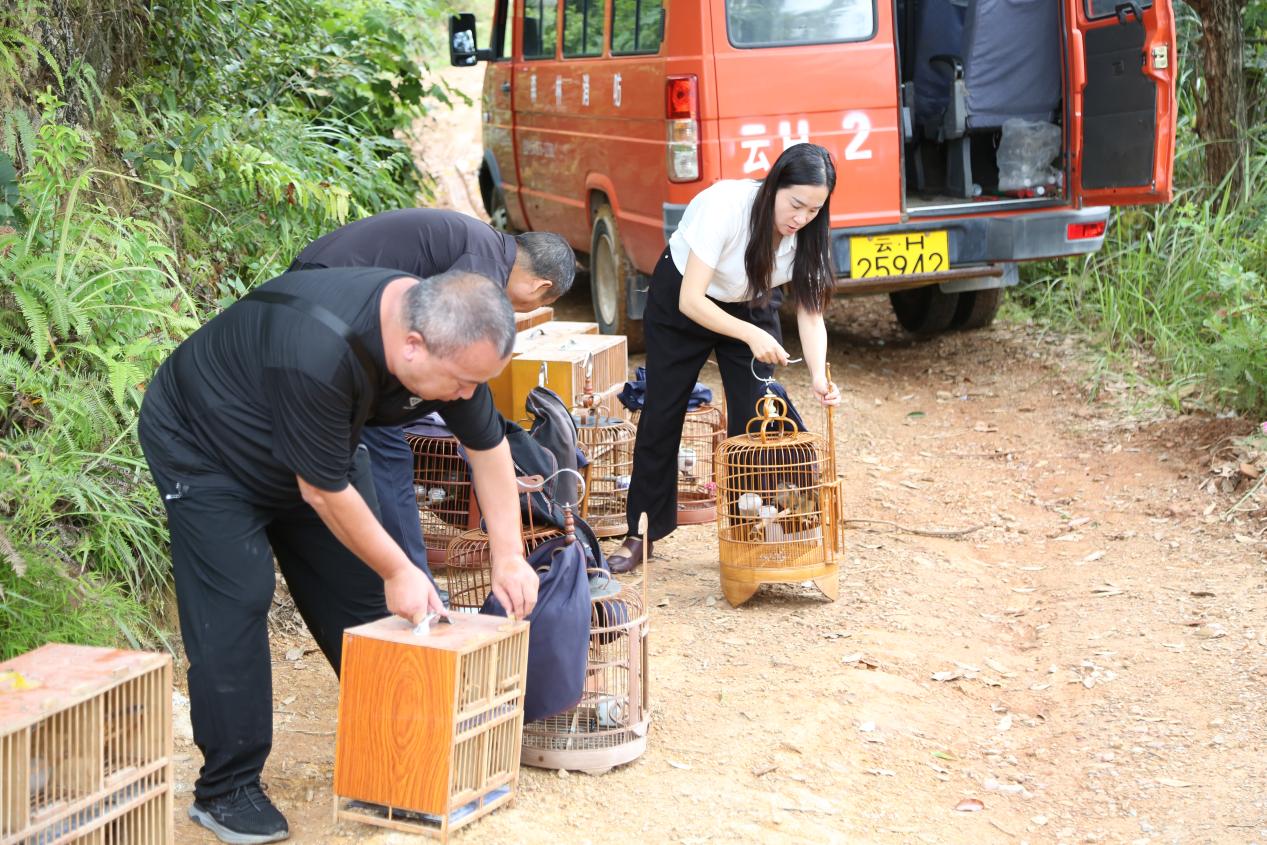近日,文山壮族苗族自治州广南县林业和草原局在境内森林植被优良区域,将专项行动中查获的55只国家二级保护动物画眉鸟,及3只国家“三有”保护动物中华鹧鸪(当地俗称“金嘎嘎”)集中放飞,让这群“林中精灵”重返自然栖息地。