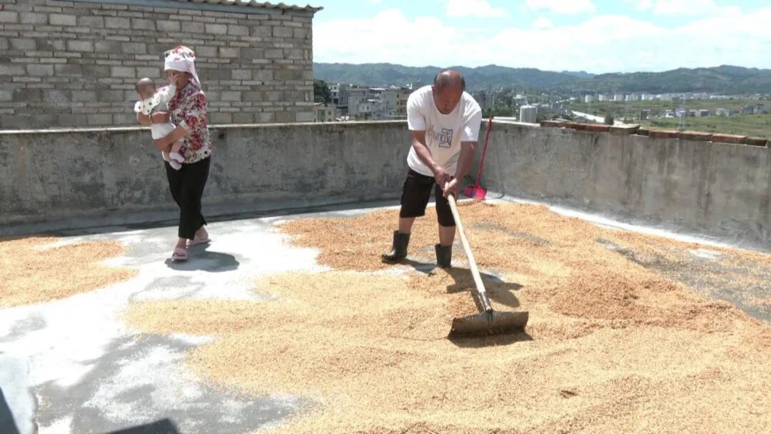 而来自广南县莲城镇南达村的陆志玉则迎来了秋收的另一项重要工作——晒谷子。“谷子今年我们已经打完了,今天天晴就来晒谷子,晒楼顶晒院子门口。”她指着自家楼顶铺满的金黄谷子介绍道,“今年收成很好,如果天晴的话半个月就可以晒好了,如果天不太晴的话就得晒一个月。”阳光洒在谷粒上,折射出温暖的光芒,也照亮了她心中的希望。