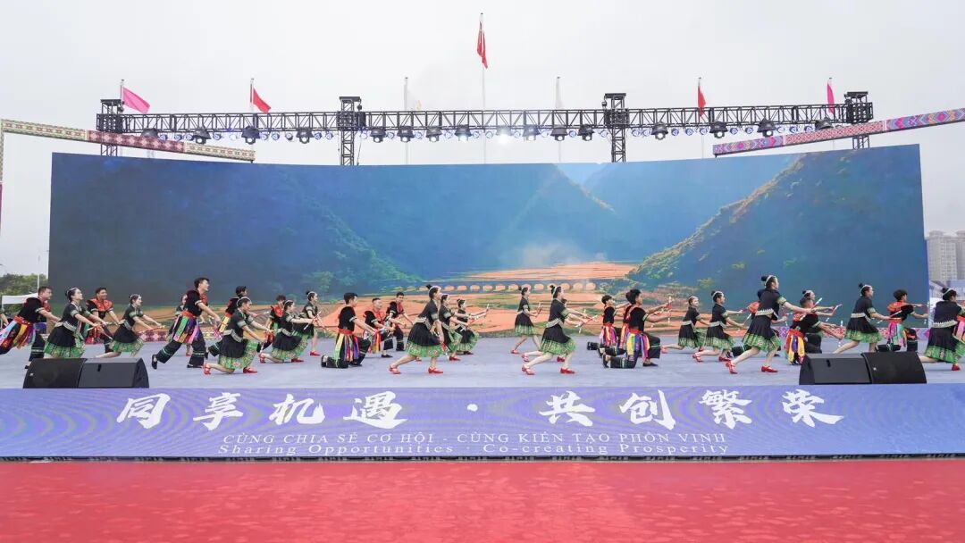 紧接着,中越双方带来的《棒棒声声棒棒棒》《青青翠竹》《苗岭花开等你来》《倮倮族铜鼓舞》《一起越山海》等节目轮番上演。整场演出歌舞交融、精彩纷呈,中越两国的文化魅力在舞台上碰撞交融,赢得台下观众阵阵掌声与喝彩。