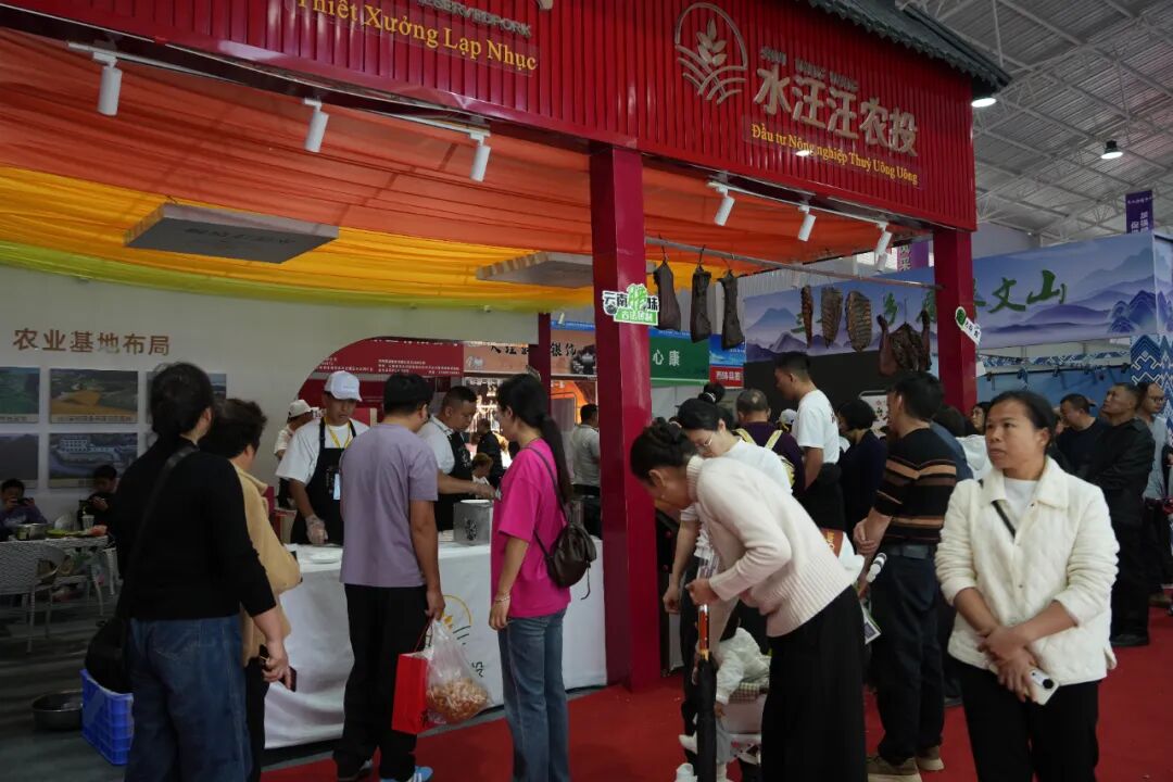 在水汪汪农投的展位上,肥瘦相间麻栗坡铁厂腊肉散发出浓郁的香味,工作人员现场煎制腊肉、香肠让顾客试吃。不一会儿,带来的冰糖小香肠便销售一空,他们立马联系仓库补货。