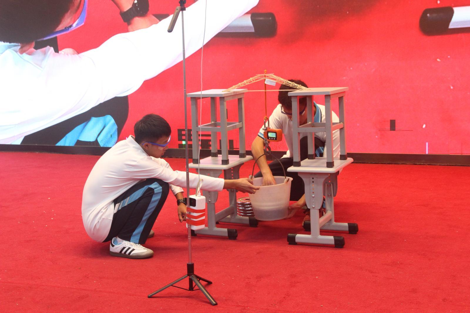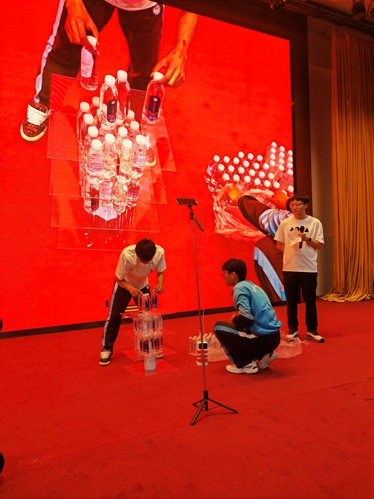 随后木梁承重比赛、纸结构比赛轮番进行。木梁承重比赛是用十余根小木棍设计一个木梁结构,使它承受尽可能多的重量,材料只能使用木棍和胶水。纸结构比赛是用两张普通的A4纸,通过折叠、卷曲、粘贴等方式,制作成可以承重的纸模型。此前,同学们通过精心设计,打造出了各种结构稳固的木梁、纸模型,当晚,在承重测试中,木梁承重的最好成绩为42.38千克,纸结构承重的最好成绩为40瓶360毫升的矿泉水。