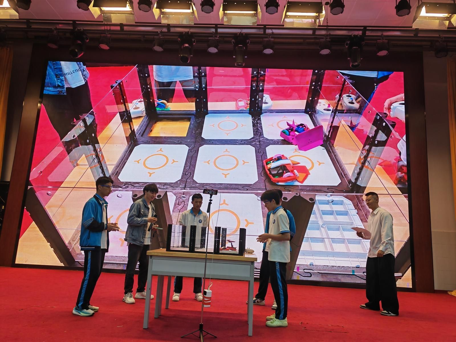 当晚的重头戏,要数格斗机器人比赛和技能机器人比赛。机器人格斗赛场上,选手通过操纵遥控器,指挥机器人进攻与防守,同时要防止掉入陷阱。在一组比赛中,一边的机器人开局就撞掉了对方的铲子,不过转头却掉入陷阱中,台下观战的同学也忍不住叹息起来。也有选手在比赛前放出狠话,不料开局5秒就被对手挑翻在地,无力回天。现场,只听见马达的轰鸣声与铲子的“哒哒”声交织,科技感十足。格斗机器人比赛教练杨璨源介绍,机器人买来的时候只有模型及简单的程序,需要对它进行编程,比如设定速度的快慢、力量的大小等,格斗主要看的是选手对机器人操作的精细程度。如在格斗中受损,可用学校的3D打印机打印部件进行修复。