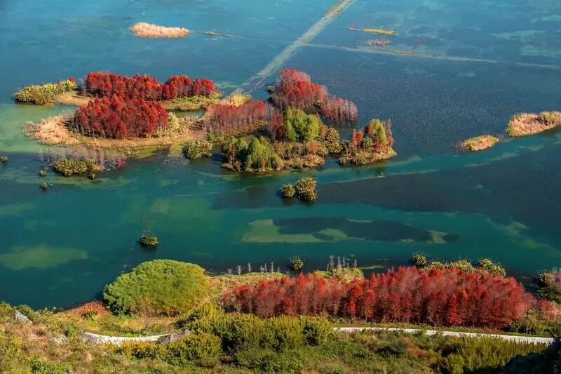 微风轻拂,景区内层林尽染,水杉林披上绯红与金黄交织的盛装,与远处青黛色的峰林相互映衬,构成一幅浓淡相宜的冬日画卷。