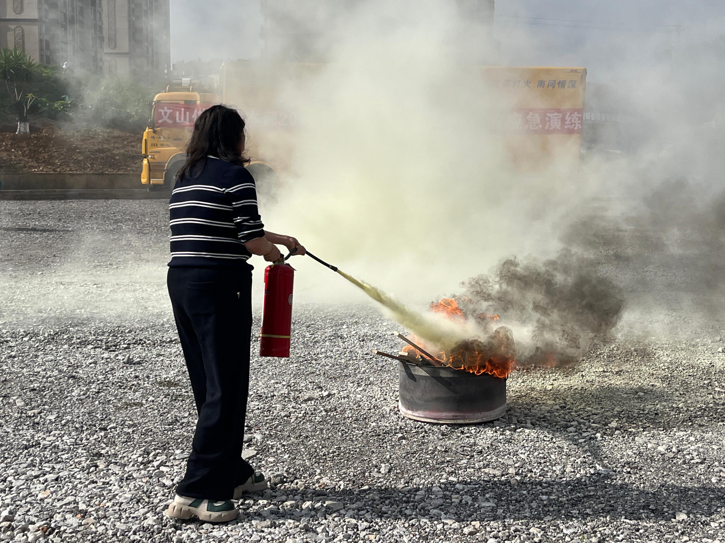 “灭火器使用要牢记‘提、拔、握、压’四步。”演练现场,消防管理专家趁热打铁开展实操教学。参训人员轮番上阵,对准模拟火点精准喷射,在实战中掌握灭火技巧。与此同时,灭火行动组、医疗救护组同步开展演练,灭火器喷射声、急救包扎实操、应急指挥调度等场景交织,还原了真实火情下的应急处置全流程。