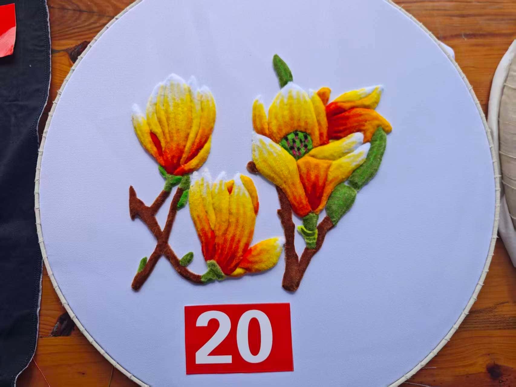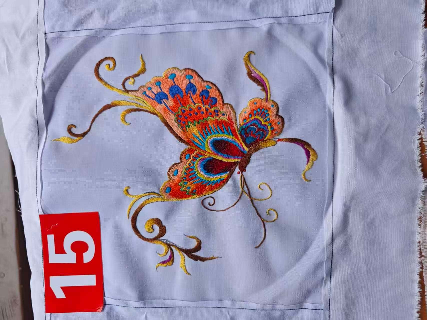 比赛现场,针线摩擦布料的细微声响交织成独特乐章。60岁的丘北绣娘唐丽珍端坐案前,神情专注得仿佛与周遭隔绝。五十年的针线生涯,让平针绣在她手中臻于化境——银针起落间,针脚细密如鳞,线条流畅似溪,一块素色布料上,一只色彩斑斓的蝴蝶正欲振翅,翅膀的纹路在灯光下泛着细腻光泽。“现在日子越过越红火,就像这蝴蝶一样,自在又有盼头。”唐丽珍抬手拂过绣品,眼角的皱纹里盛满笑意,每一针都藏着对生活的热爱。