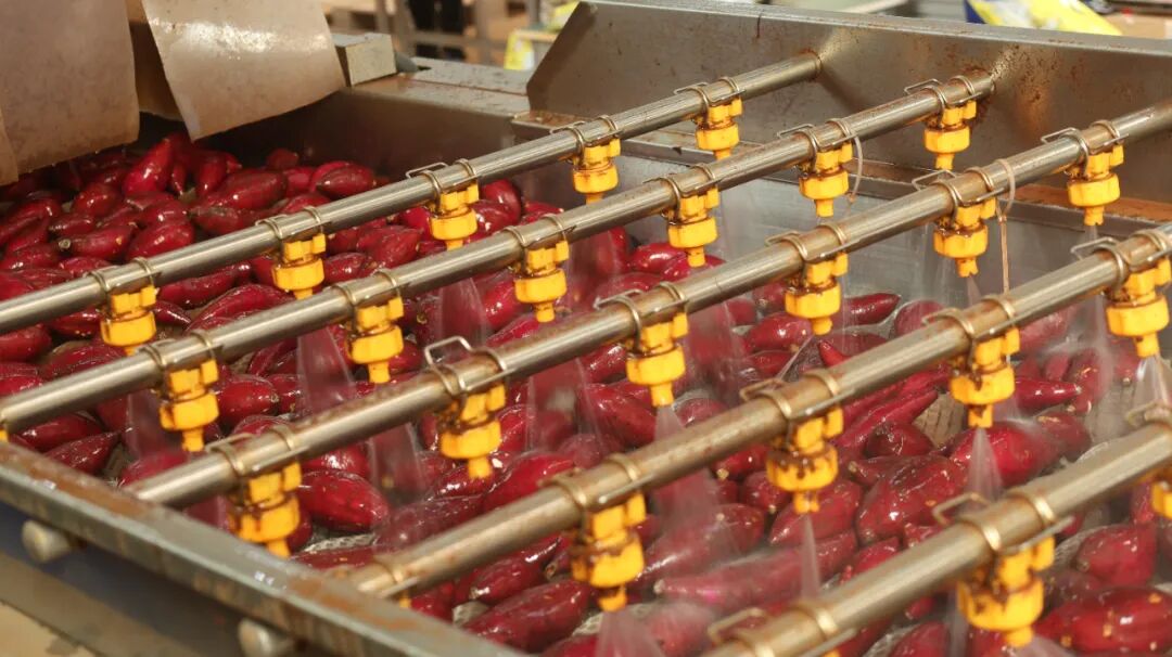 出库前,一堆堆红薯通过传送带进入三重高压清洗系统被洗净烘干,二次筛选后,两条流水线一同称重打包,整个处理过程高效而精准。