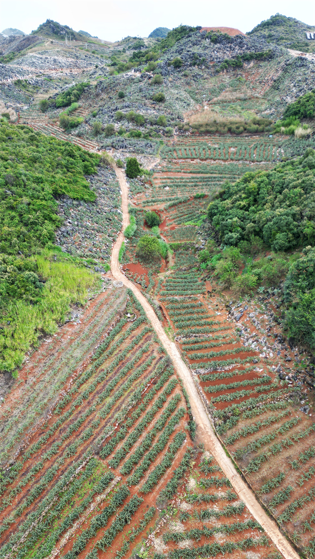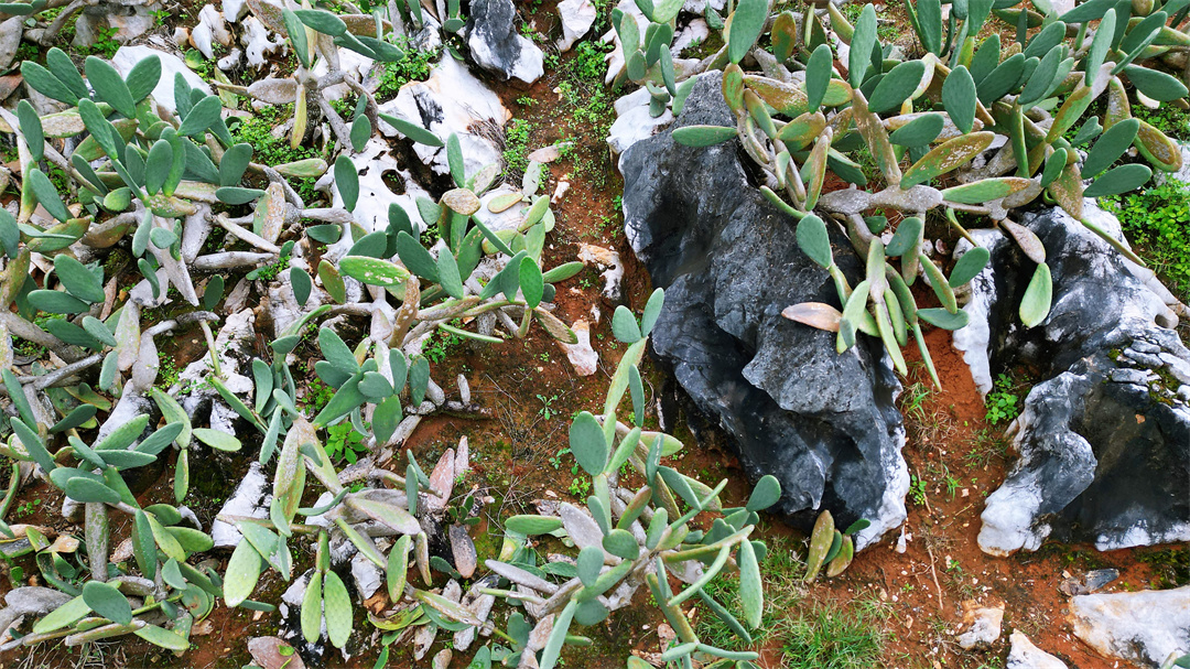 无人机镜头下的庄子田后山,让人震撼。石漠化的灰白,红土地的红,仙人掌的绿,三色交织。绿与白,针锋相对,互不相让。