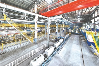 图为云南神火公司自主生产的阳极炭块通过悬链系统进入组装生产线。【王扬 摄】