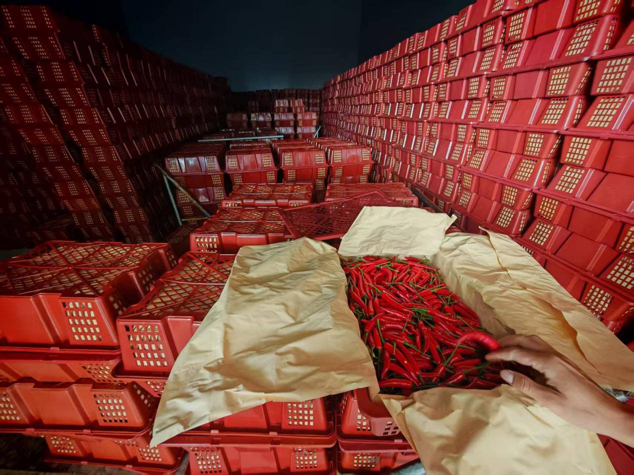 更棒的是,我们还能“闯世界”。依托稼依辣椒城和5个田间市场,我和伙伴们被精心包装,跟着冷链车一路向南,出口到越南、泰国。仅亚飞公司每年就有1万吨兄弟姐妹们开启跨国旅程,“中国稼依辣椒城”的招牌,跟着我们越传越远。