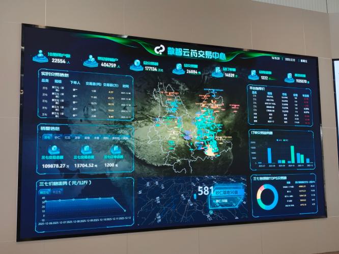 走进位于文山市三七综合交易市场的数智云药(文山)交易中心,大厅显示屏上实时跳动的三七交易数据格外引人注目:截至2025年12月12日,平台三七交易总额达109878.27万元,总量13704.52吨,订单1200笔。这一串串数字背后,是文山州三七产业在数智化浪潮下的蓬勃发展。