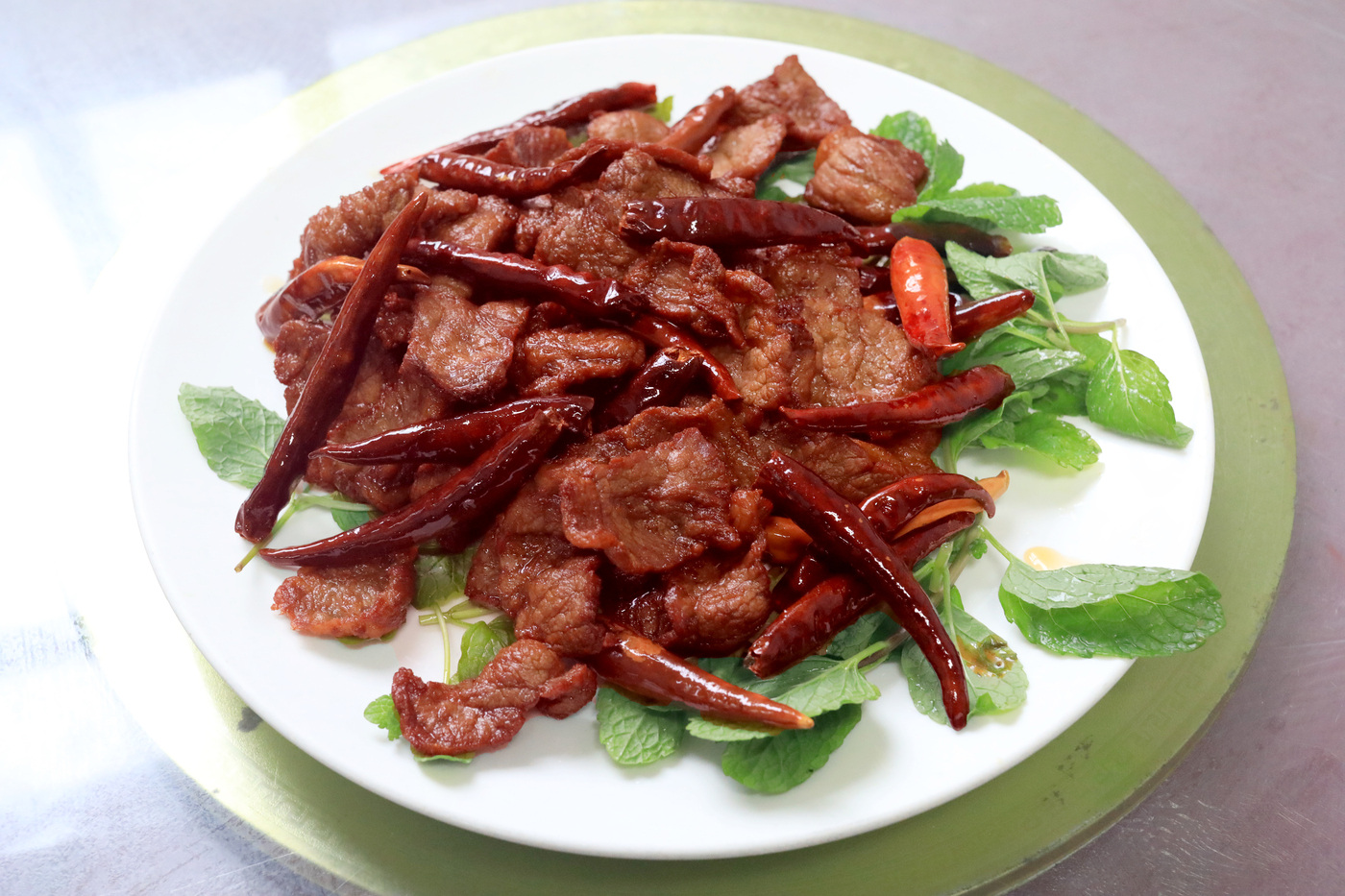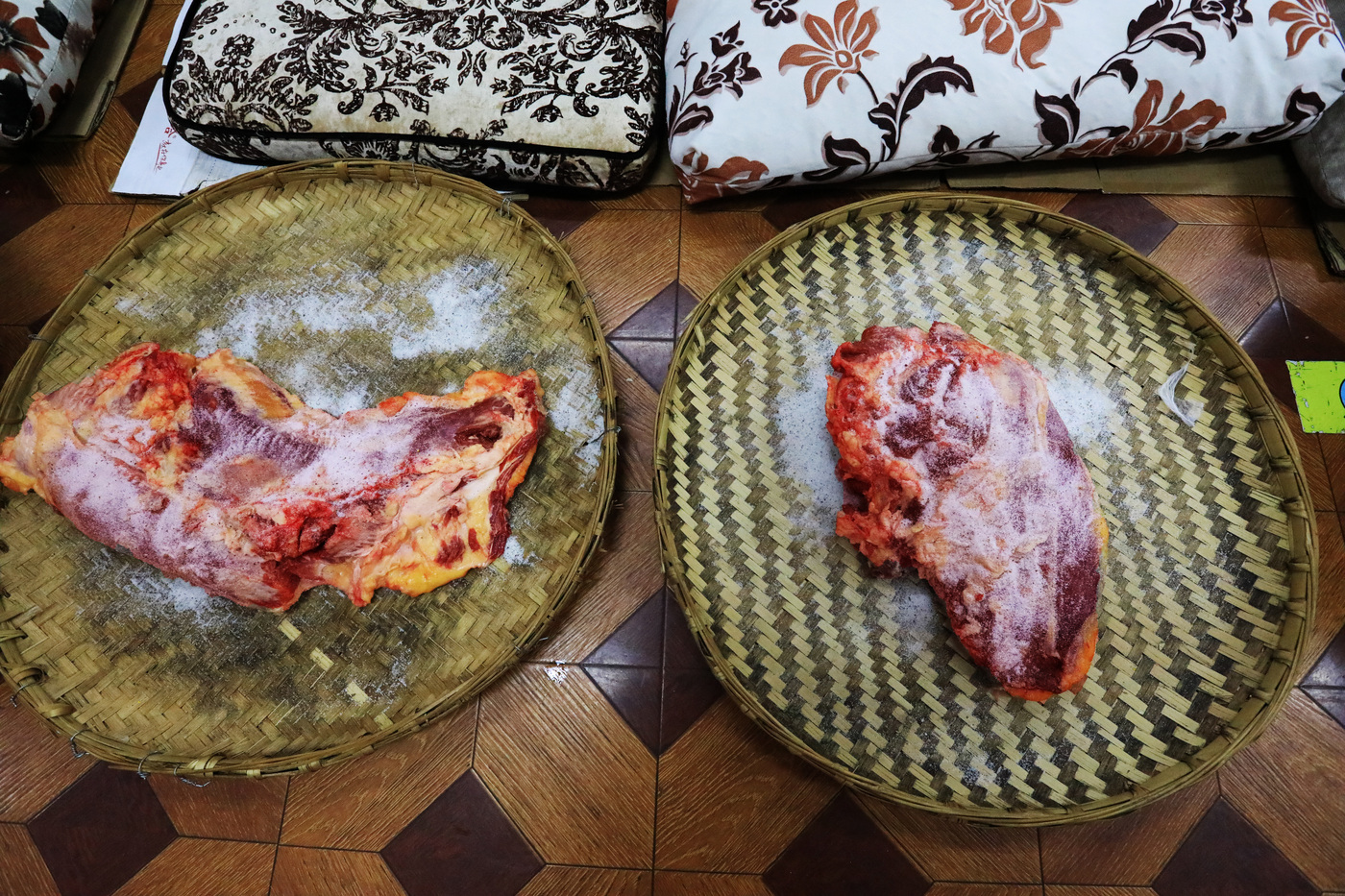 丘北腌制牛干巴的历史已近百年,源于当地先民保存牛肉的民间智慧。这里冬暖夏凉,每年十一至十二月是腌制的黄金时期。制作时以盐巴、花椒面等香料精心腌制牛肉,初腌两小时后入缸,继续腌渍十五至三十天,其间还需翻缸确保风味均匀渗透。