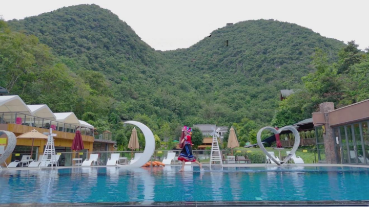 龙华秘境半山酒店生态旅游度假村运营经理张建军介绍:“景区建有观景栈道,海拔为1488米,还有个25米*12米的标准无边界游泳池,这里气候温和,常年26℃左右,负氧离子含量比较高,每立方米可达4000个单位左右,空气湿度适合。来这里旅居的游客各地的都有,大多都会选择住上一两个星期或者一两个月,尤其是每年7至9月份八宝田园风光正好的时段,我们这里满房率均能达到90%以上。我们招聘的员工也大多是附近的村民,来这里旅居过的游客反馈最好的是我们的村民员工服务特别好、热情亲切。遇到‘五一’等节假日,客流比较多,我们还会策划开展一些活动,比如唱敬酒歌,开篝火晚会等,让游客体验广南特色民俗文化,或者亲自参与当地特色美食制作。”