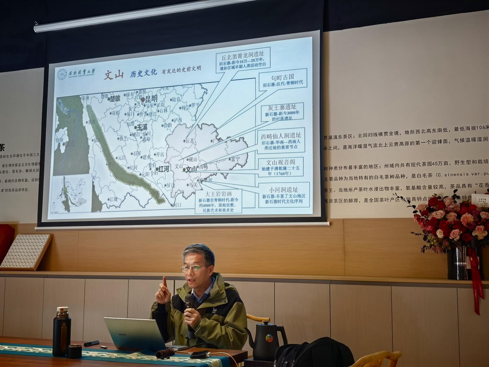 蓝增全教授侧重讲解古树茶资源与古树茶文化传承,阐述了茶产业的全链条发展。李峻副会长讲解了普洱茶商品形态的流变。“茶不仅是饮品,更是文化的载体。”他说,“文山州多民族聚居,各民族都有独特的饮茶习俗,这是宝贵的文化资源。将这些文化元素融入产业发展中,能够极大提升文山茶的附加值和影响力。”