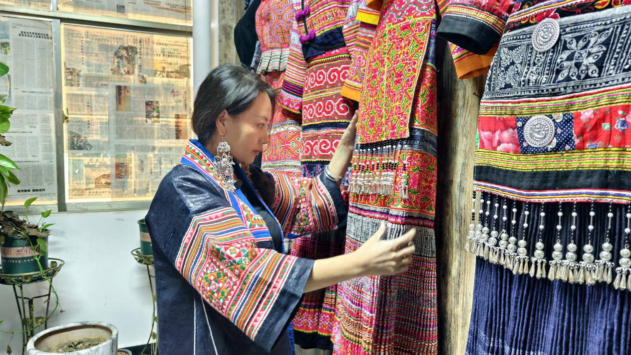 杨国仙的绣品里,藏着苗族的文化密码。2023年马关县花山节上,她设计的苗族盛装惊艳全场:衣襟蝴蝶纹暗合创世神话,裙摆几何纹镌刻迁徙记忆,银饰碰撞声似《苗族古歌》回荡。这件斩获一等奖的作品,不仅是承载民族文化的“无字史书”,更成为她非遗传播的起点——如今,作品中的经典纹样通过直播间,化作都市白领的服饰点缀、在外游子的乡愁寄托。