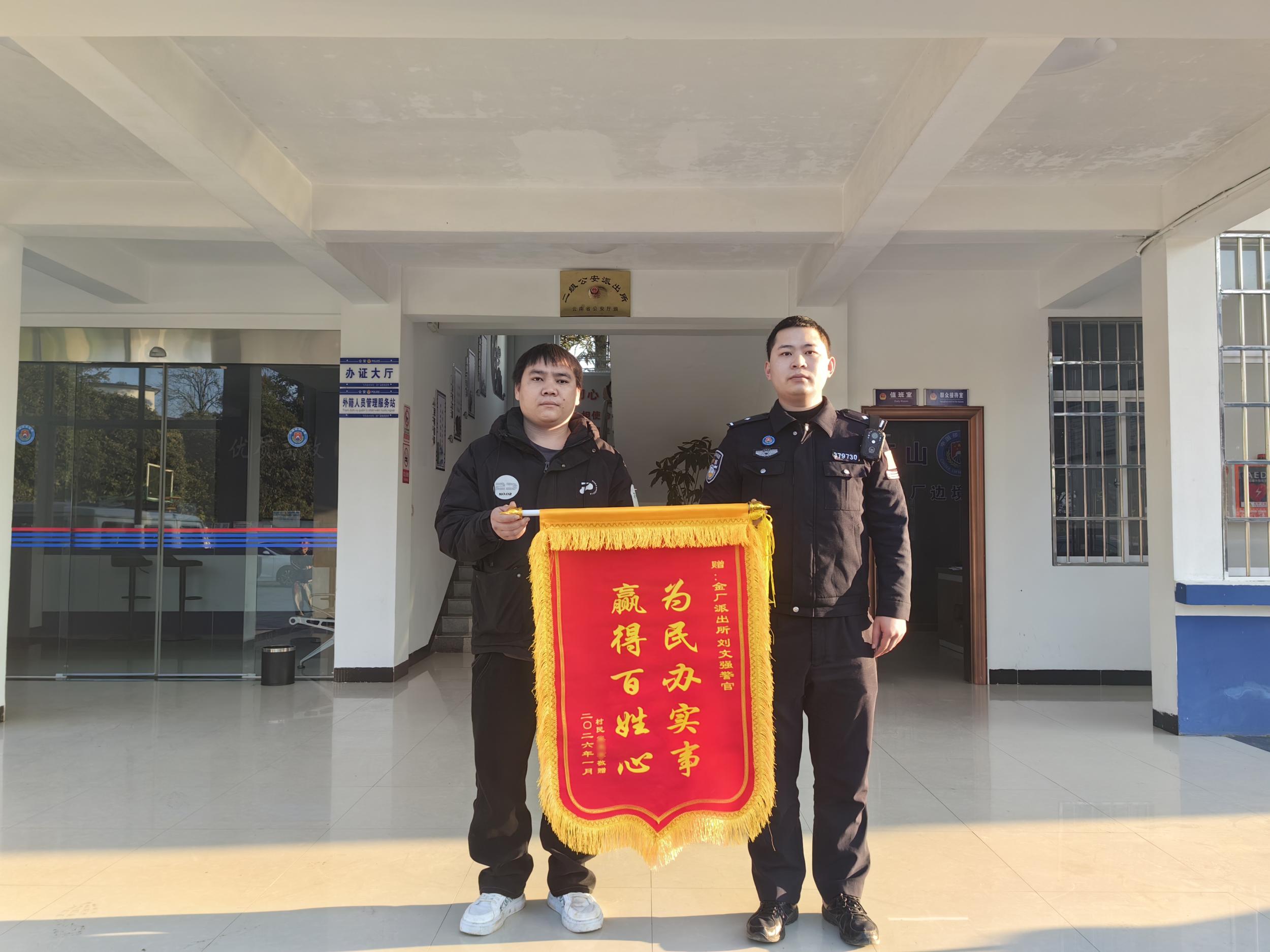 “那天晚上多亏了你们,谢谢警察同志!”近日,一面印着“为民办实事,赢得百姓心”的锦旗被送到文山边境管理支队金厂边境派出所,辖区群众熊大哥紧紧握住民警的手,连声道谢,这一幕,源于数日前寒夜里的一次暖心护送。