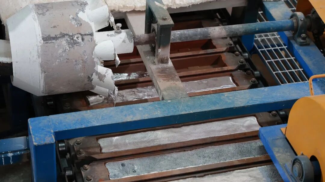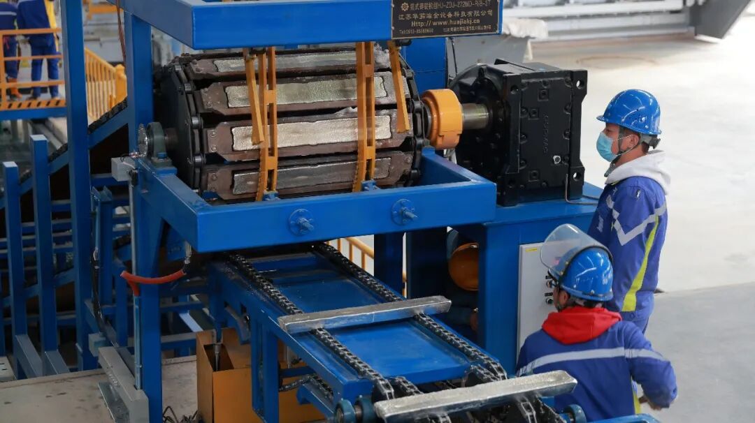 2025年10月,年产10万吨环保循环型铝合金锭1号生产线开始安装设备,目前已进入调试生产阶段。现场技术人员正全神贯注地盯着控制屏幕和流水线,炽热的铝液在自动化系统的精准控制下,经装炉、熔化、搅拌、精炼、静置、过滤等工序,平稳流入链式铸锭机铸造,最终冷却成型为一块块光泽闪烁的标准铝锭,随后被机械臂自动堆垛、打捆。