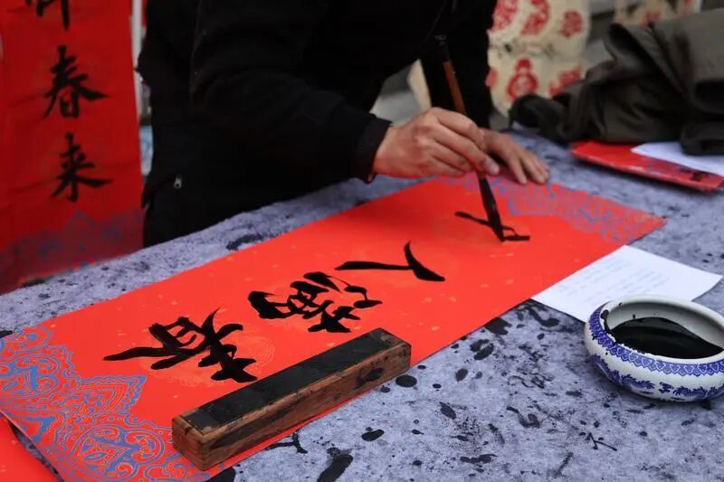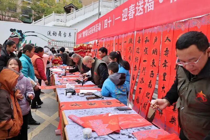 活动现场,红幅铺展、墨香四溢,书法爱好者们挥毫泼墨,将美好的祝愿凝于笔端,一副副寓意吉祥的春联、一个个满载祝福的“福”字跃然纸上。
