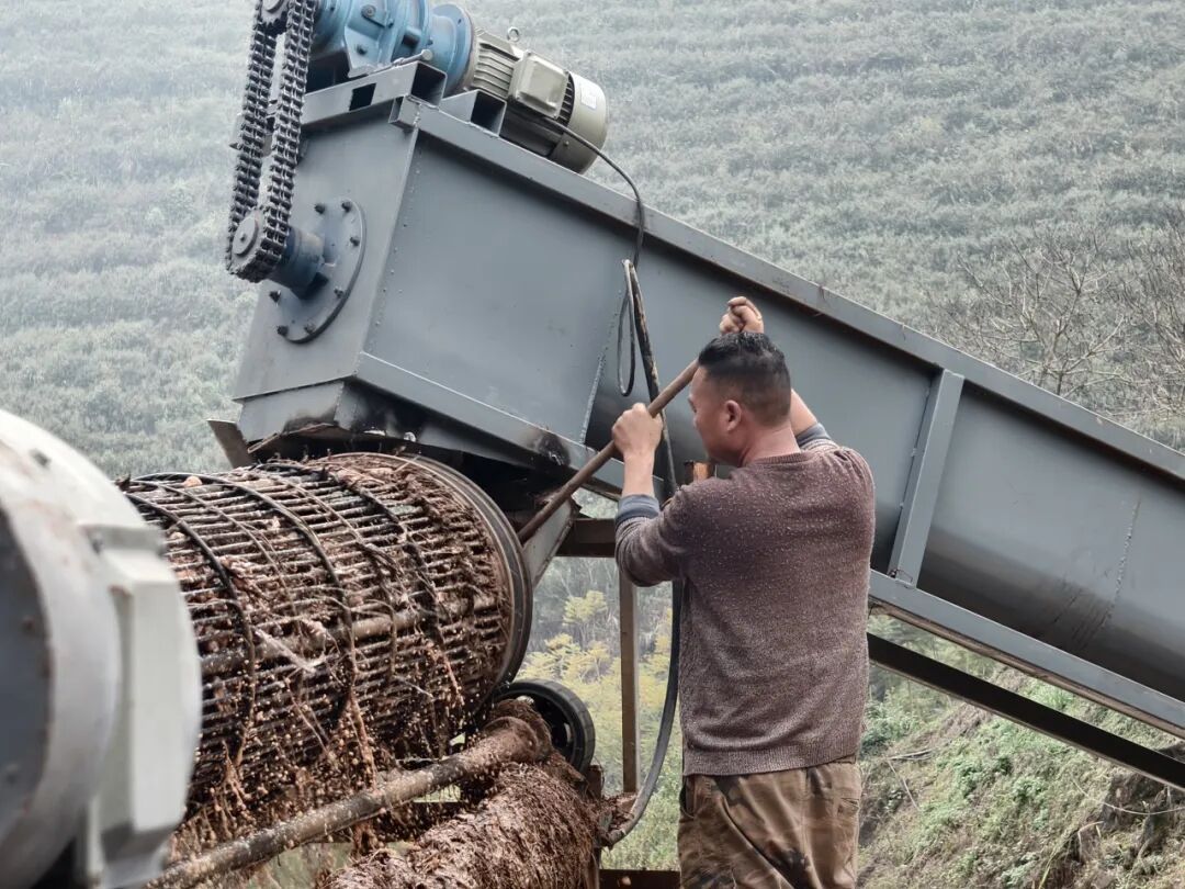 开机当日,加工车间内一片繁忙有序的景象。在机器持续的运转声中,满载芭蕉芋的装载机往返穿梭,将原料不断输送至料口。工人们各司其职,熟练操作设备,并实时巡查流水线运行情况,及时疏通保障生产顺畅。经过清洗、粉碎、过滤等多道工序,一颗颗芭蕉芋实现淀粉与渣土高效分离。分离出的淀粉浆液流入沉降池,经后续处理即可储存待售。