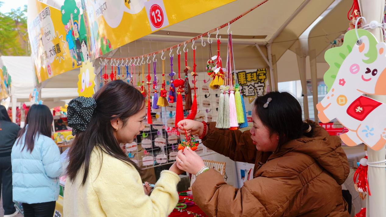 行走市集间,满眼皆是热闹与鲜活。红色年货区春联、福字整齐排列,创意红包款式多样惹人驻足,市民精心挑选年味好物;手工编织挂件色彩鲜亮,返乡青年摊主指尖翻飞接单;孔明灯摊位前,退役军人摊主耐心讲解燃放须知;底圩茶摊前,摊主打开茶品包装供人品鉴;爆米花摊位前,大学生摊主现场制作米花售卖,部分摊主还开启直播带货,在线展示推介商品。