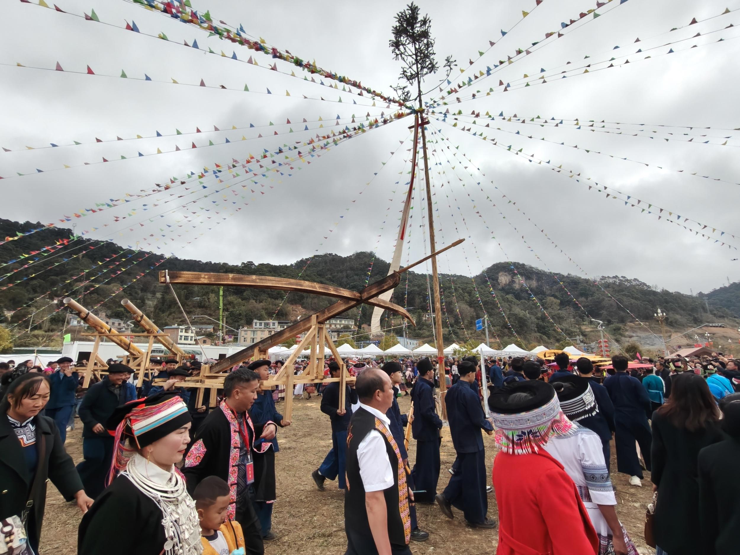 正月初三,文山壮族苗族自治州麻栗坡县磨山开发区彩带飞扬、鼓乐喧天,现场人头攒动、喜气洋洋。象征着团结吉祥、思源奋进的花杆高高矗立,来自各地的各族群众身着绚丽盛装,怀揣新春喜悦欢聚一堂,共同见证麻栗坡县铸牢中华民族共同体意识主题活动暨2026年春节花山节隆重开幕。