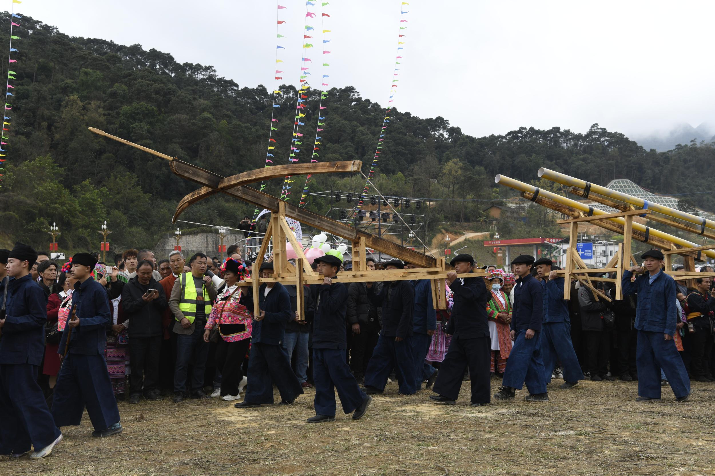 当日中午12时许,开幕式在万众期待中拉开帷幕。祭花杆仪式率先登场,悠扬的芦笙曲调搭配古朴的祭杆歌谣,身着盛装的各族群众组成整齐队伍,环绕花杆缓步前行。队伍中,代表麻栗坡少数民族传统体育特色的一架巨型弩和两把巨型吹枪格外醒目,尽显浓郁的边关民族风情。