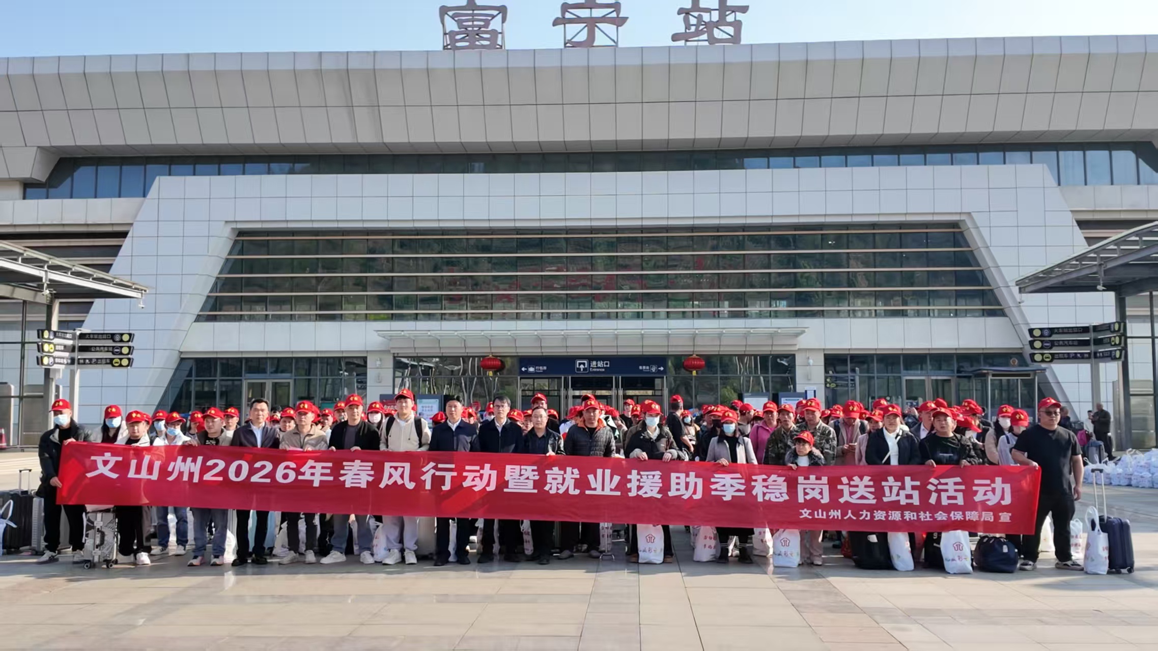 正月初八,春节收假首日,文山壮族苗族自治州“春风行动”暨就业援助季稳岗送站活动富宁县集中输出仪式在富宁高铁站举行。400名务工人员搭乘D3812次务工专列奔赴广东,开启新一年增收致富之路。