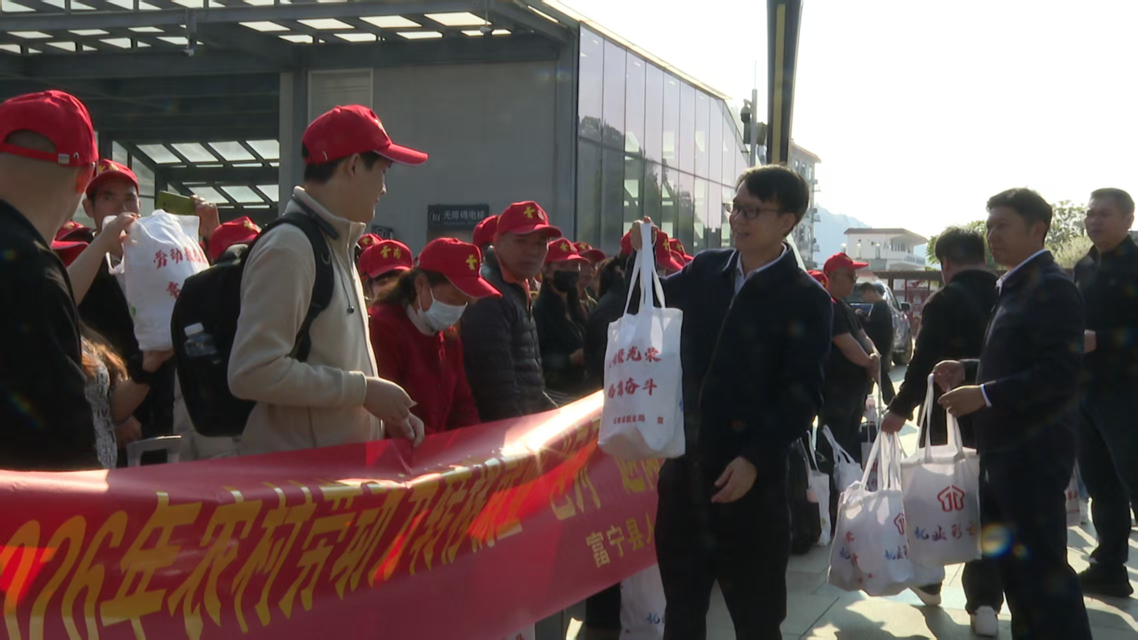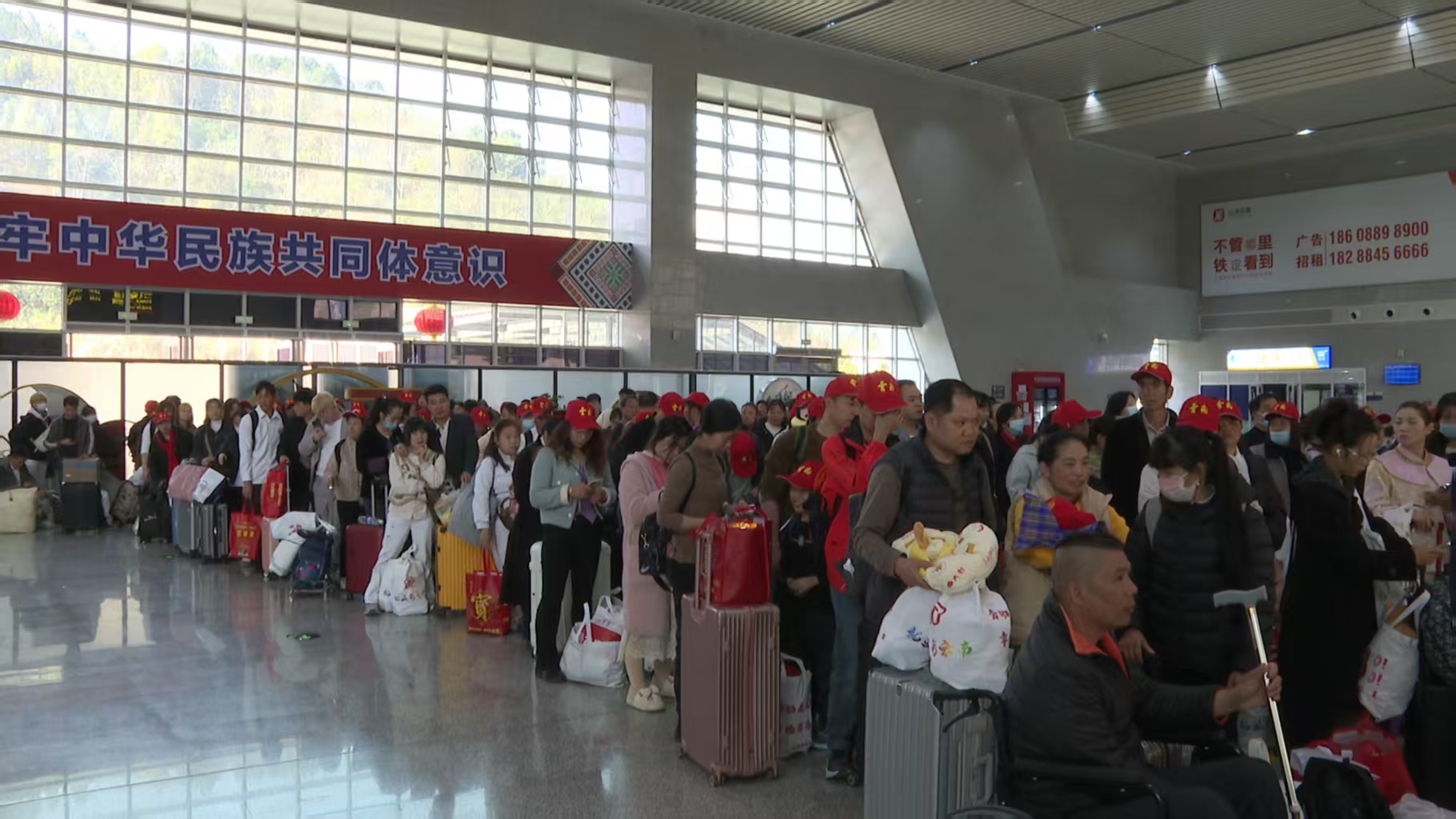 富宁高铁站站前广场人头攒动,务工人员提着行囊、拖着行李箱,在工作人员引导下有序排队、核对信息。现场还为大家发放爱心礼品,全程贴心服务温暖人心。