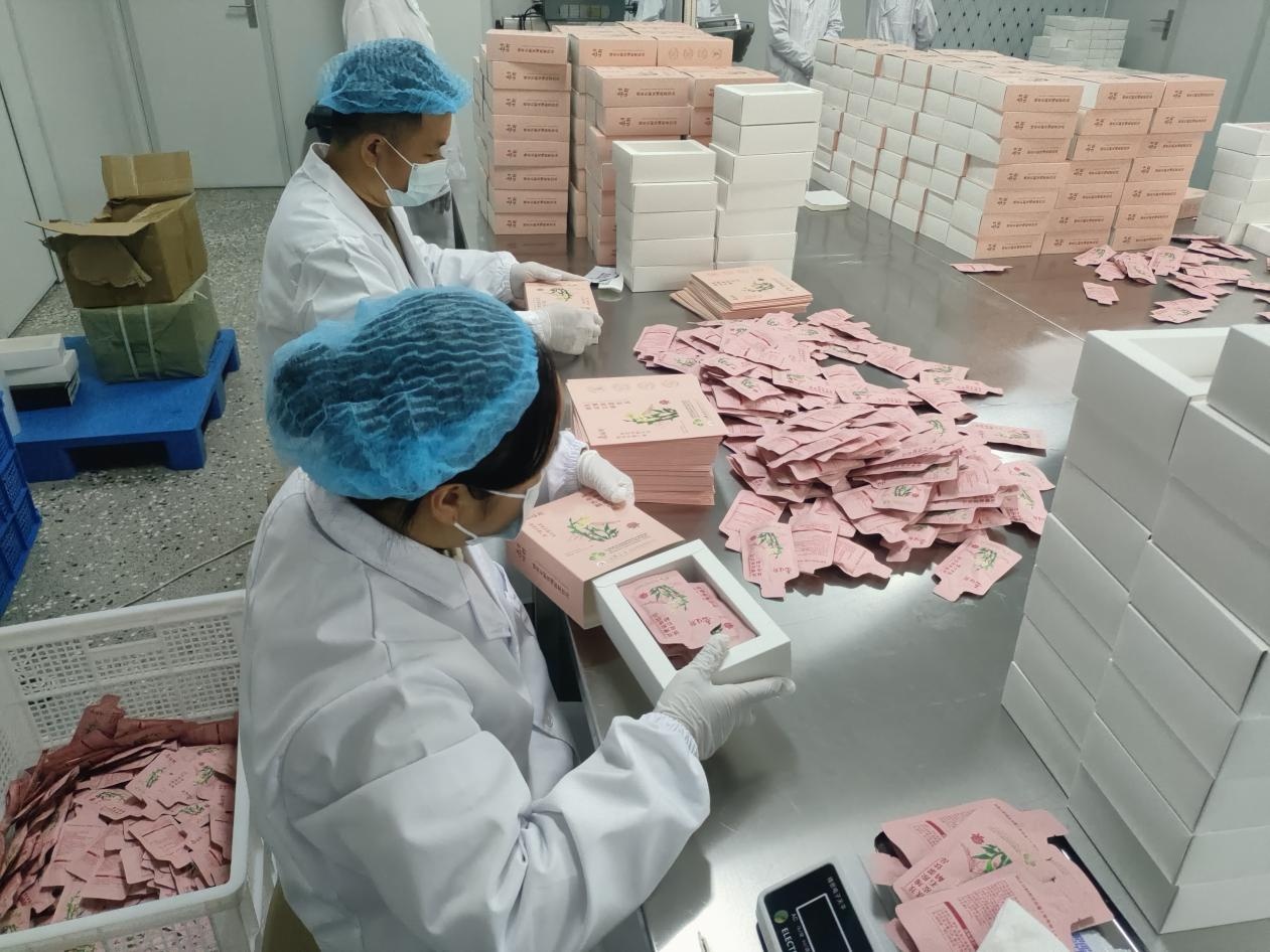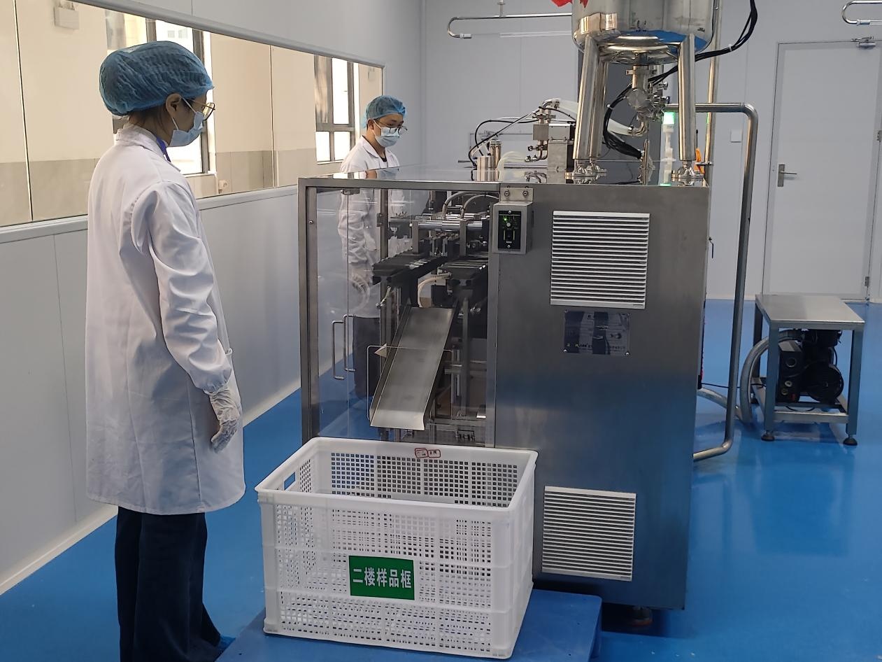 “这个是小袋灌装机,一分钟可以灌装80袋。是用我们前期调配的成品到这里进行灌装,灌装完成后封口,重量检测,再进行灭菌、包装和打码,就可以出库了。”生产车间技术员农想边操作设备,边向记者介绍。