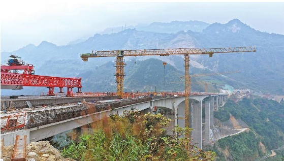 达比河大桥全长587米,主桥采用连续刚构桥型设计,跨越深达214米的峡谷,桥址区属构造侵蚀低中山地貌区,地质坚硬,气候复杂,施工难度大。中交二航局项目团队根据地形特点科学设计修建施工便道、钢栈桥与钢平台,结合人工挖孔和冲击钻施工方式完成桩基施工,在保障质量安全的同时加快施工进度。在施工组织上,项目部采取错峰施工应对极端高温,合理规划工序安排,抢抓旱季施工,充分运用施工黄金期,有序组织机械设备和人员进场,细化责任分工,确保各项工作部署到位、落实到底,安全高效实现全桥双幅贯通。