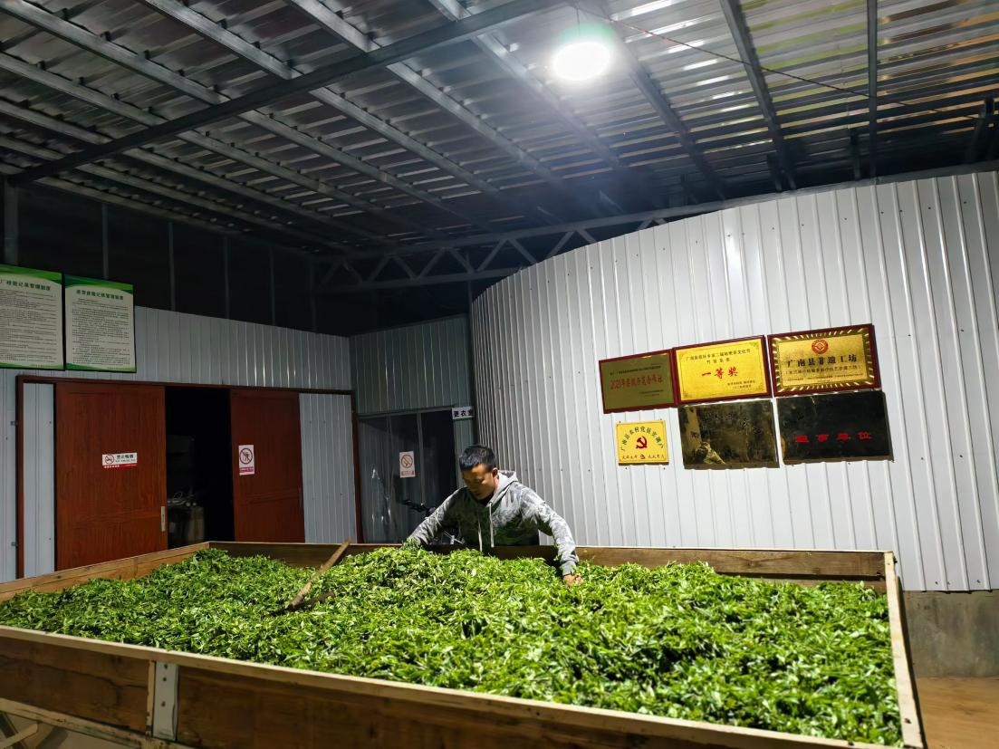 山上采茶忙,山下制茶香。在同剪村底圩“姑娘茶”非遗代表性传承人王志权的茶厂里,机器轰鸣,茶香四溢。王志权正忙着将当天采摘的春茶进行加工。只见他将新鲜春茶进行萎凋、杀青、揉捻、晾晒等工序,一片片鲜叶逐步蜕变成干毛茶,茶香弥漫其间。据了解,永兴茶叶合作社每天从同剪、者兔九龙山等地收购1000余斤鲜叶,收购价单芽每斤30元,一芽一叶收购价大概6至7元,售价绿茶每斤40元,红茶每斤60元。