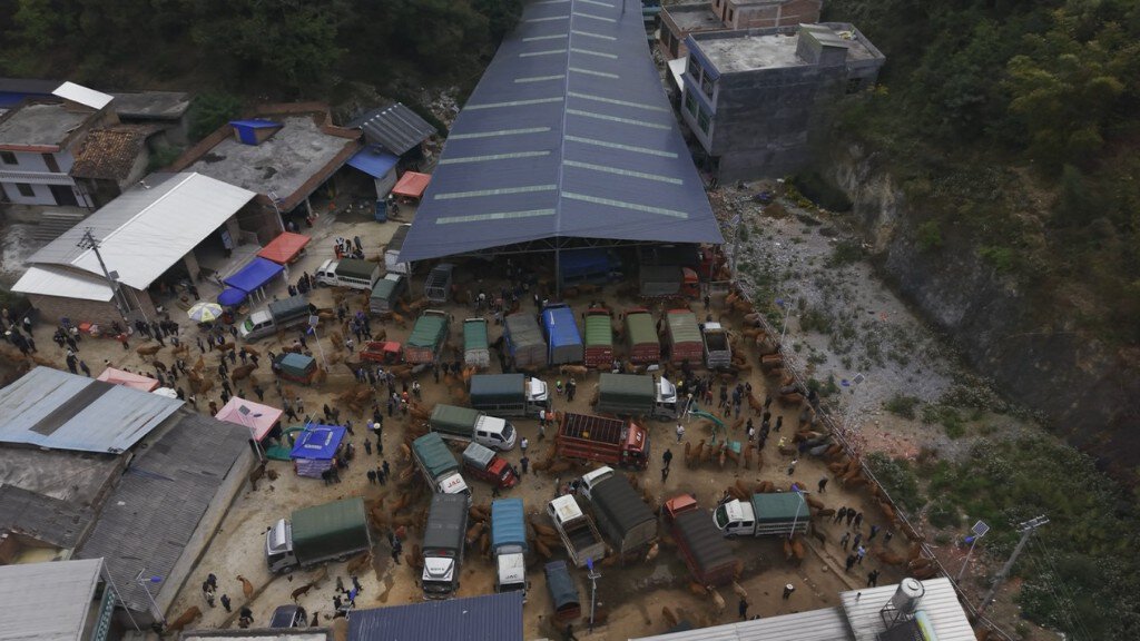 清晨,文山壮族苗族自治州广南县黑支果乡天生桥牛交易市场已是一片沸腾。此起彼伏的牛鸣声、买卖双方的讨价还价声、商贩的吆喝声交织在一起,热闹非凡。