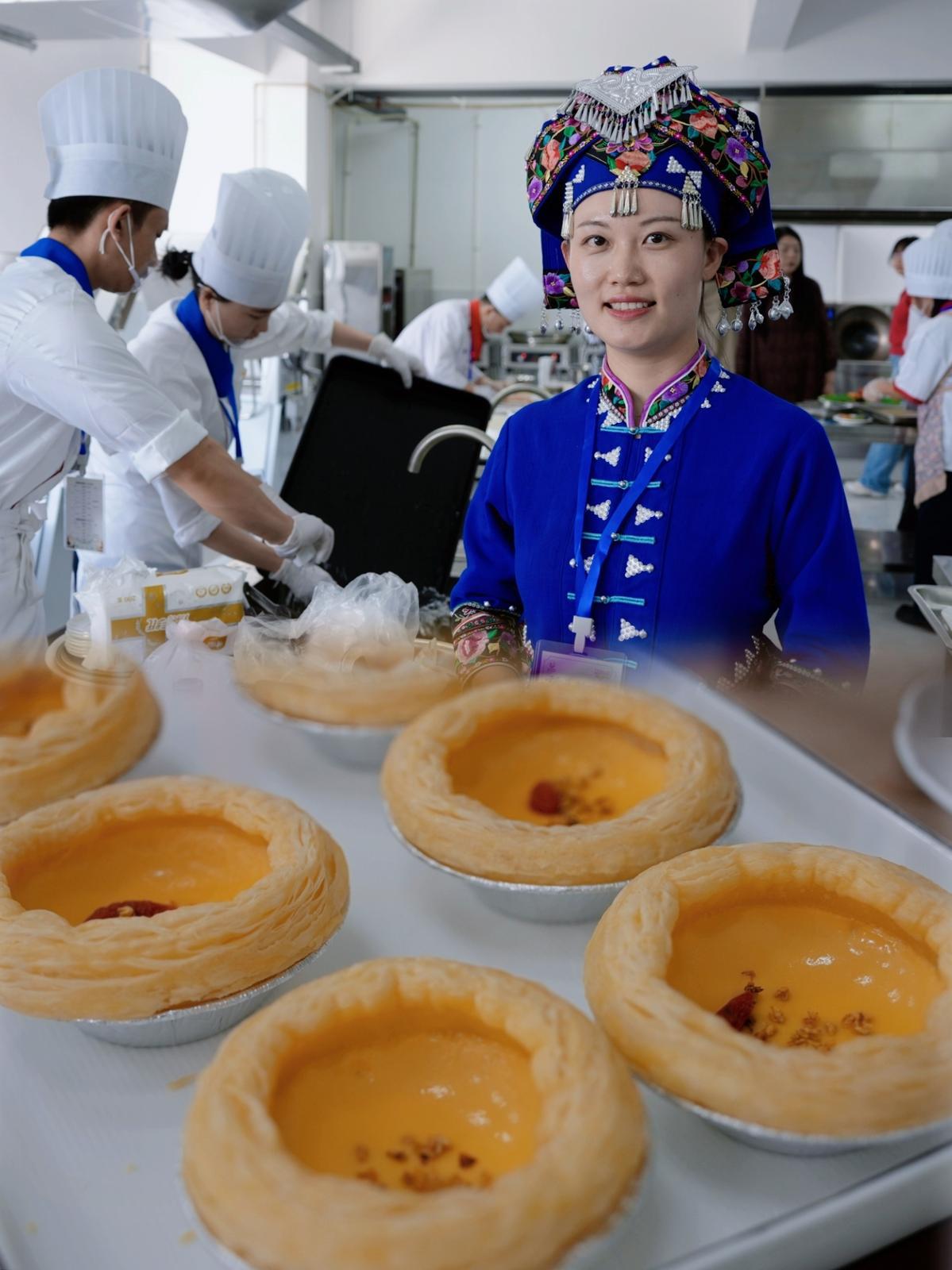 “我们推出的是七粉蛋挞,精选文山道地药材三七为核心原料,凸显本地特色饮食文化。搭配桂花与枸杞,既能中和三七微苦口感,实现良药不苦口;又凭借天然清甜香气减少白糖用量,严控热量,达成美味与低卡、口感与养生的双重平衡。”文山州委州政府机关食堂参赛队董嘉琪推荐道。