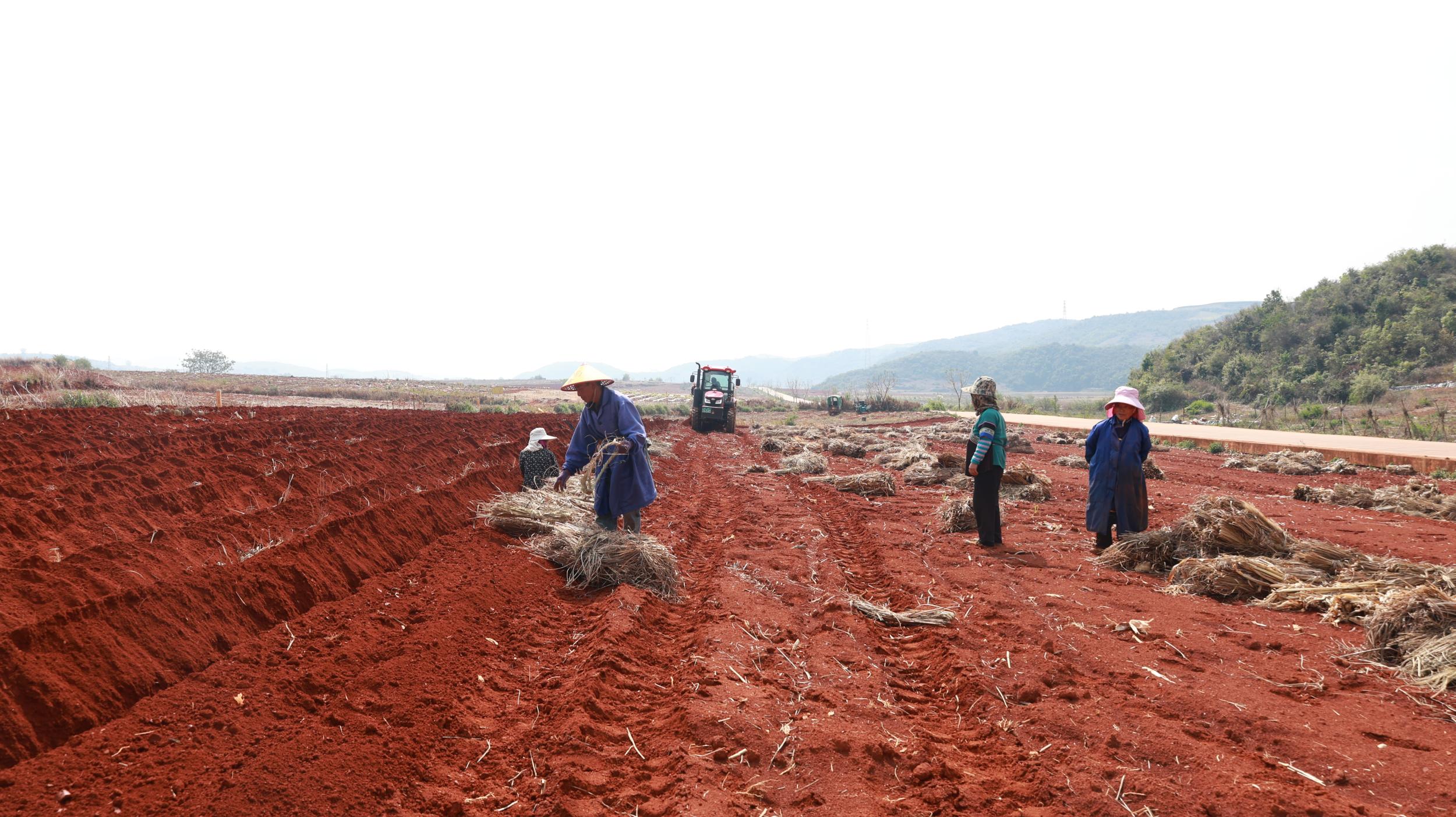 走进红甸乡的田野,放眼望去,广袤的红土地上,一片片规整的田垄里,农户们正三五成群、分工协作,全身心投入到山药栽种工作中。