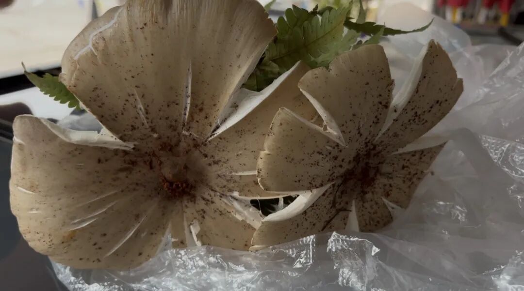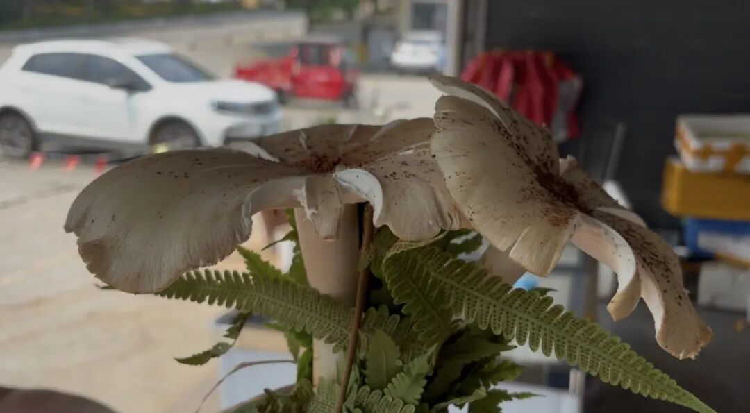 记者看到,这两朵黑皮鸡枞伞盖初开,菌身脆嫩挺拔,一看就是清晨刚破土的头水货,鲜气隔着老远都能闻到,眼下正是口感最佳的时候。
