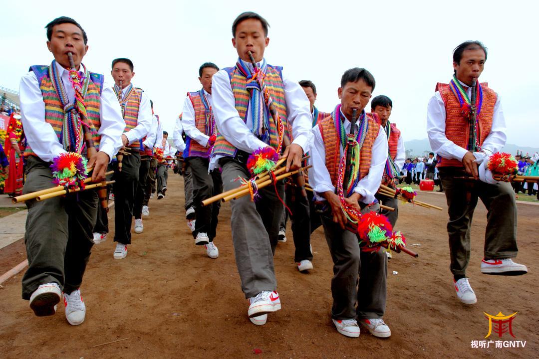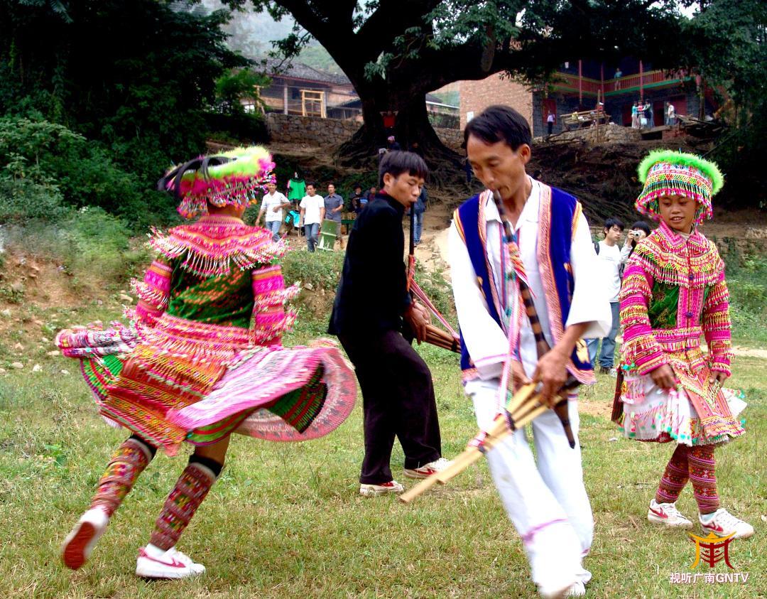 踩花山是汉语称谓,苗语则称“巩道”。为理清来龙去脉,走访了广南县史志办副主任、县苗学会副会长熊玉林,他解释“巩道”的确切含义是在山野里悼念,即“郊祀祭”的意思。“巩道”这个节日实际上是来源于苗族对蚩尤的悼念,即在郊外祭祀蚩尤。广南的苗族“踩花山”活动,要数黑支果乡的采山坪村最为热闹,可谓名扬四方。每年农历正月初三,该村都要自发举行。节日期间,来自各村各寨的苗族群众身着盛装来到该村活动的会场,吹起芦笙,跳起欢乐的芦笙舞,男女老少自择对手进行对歌比赛。同时,还举行穿花衣、斗牛、打陀螺等活动。踩花山时间一般三、五天不等,有的甚至是七、九天。