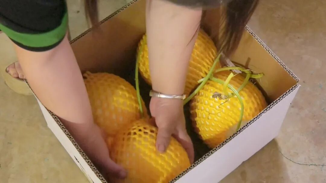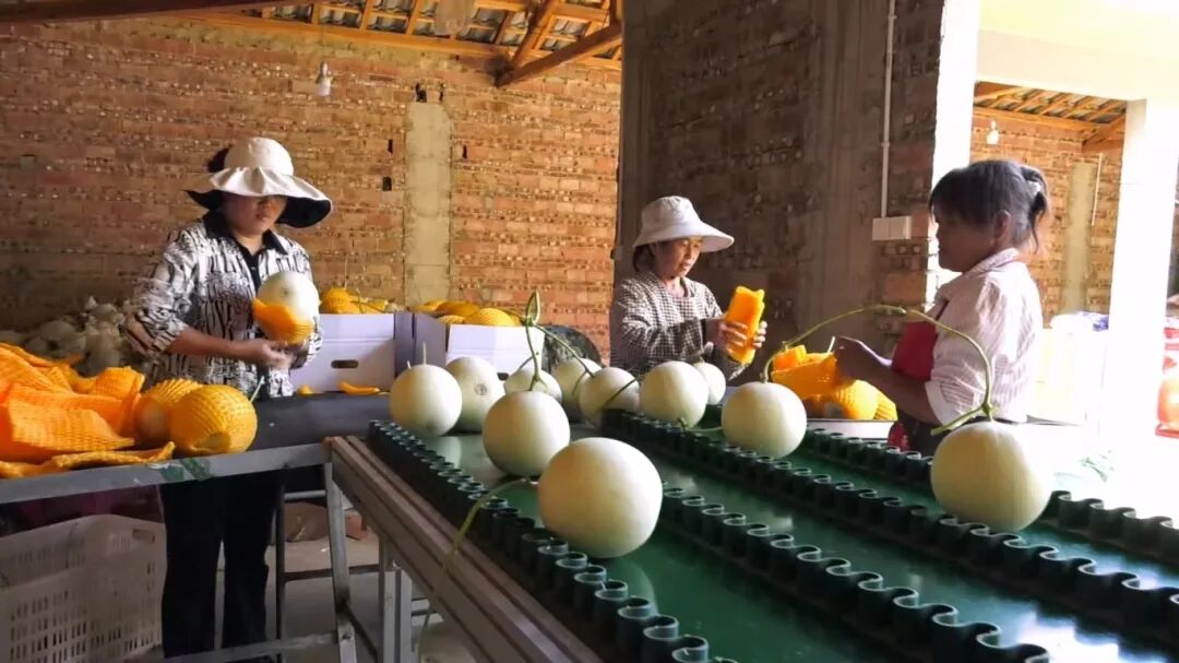 分拣厂内,工人们迅速撕去套袋,用小剪刀精心修剪残留枯枝,修剪完毕的蜜瓜经过称重分装后,由传送带平稳送至包装区。