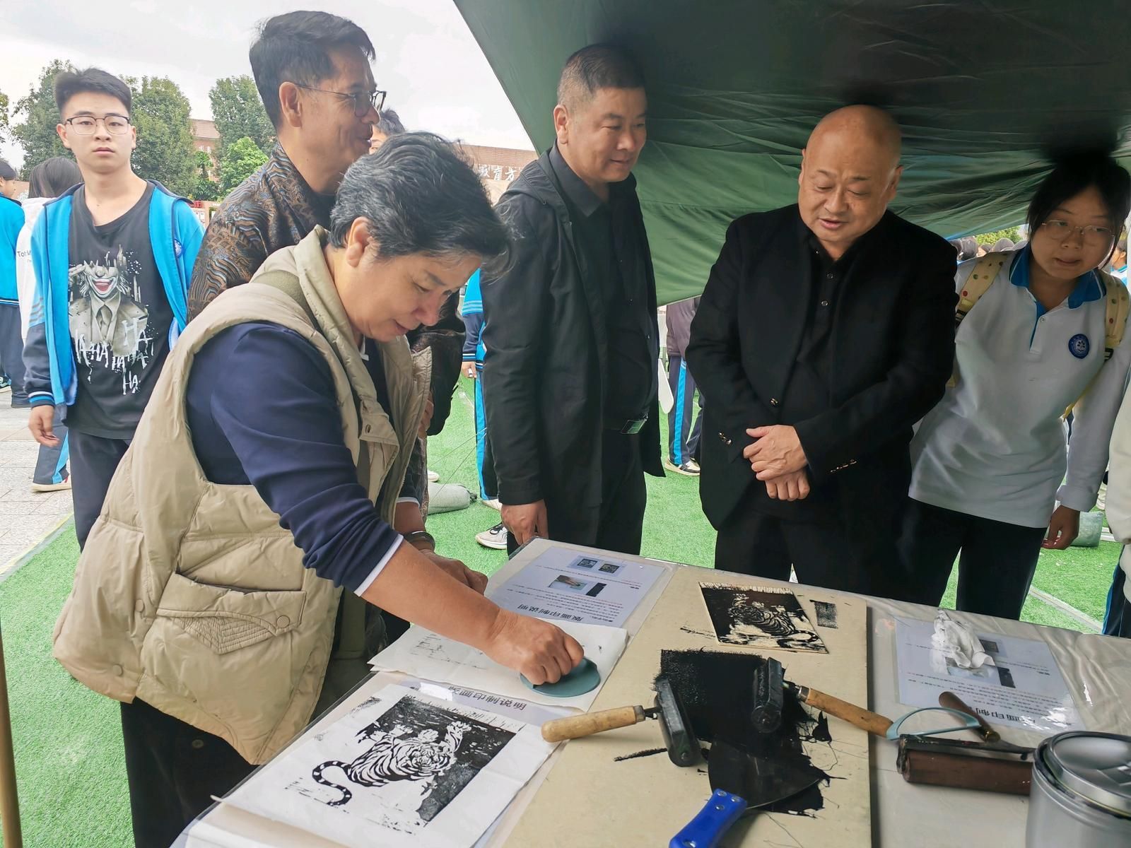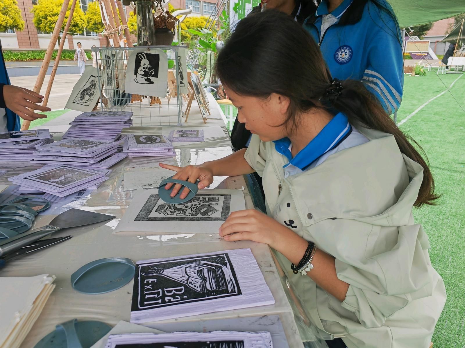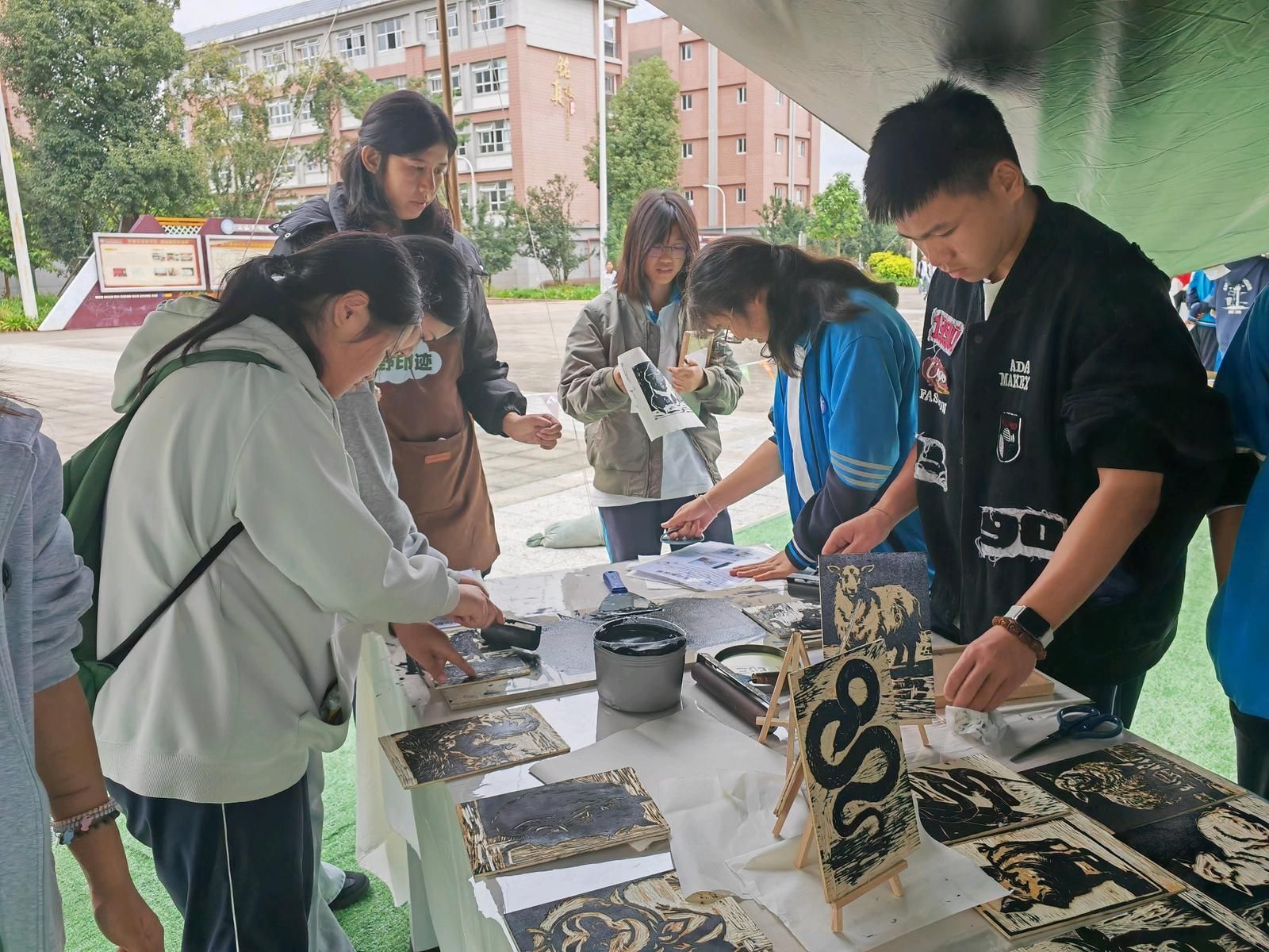 选一幅喜欢的木板图案,刷上油墨,盖上宣纸,按压拓印完成后再晾干,安上画框,短短几分钟,一幅栩栩如生的版画就完成了。11月11日上午,在文山市城南中学2025年文化科技体育艺术节上,旷野印记版画主题创意营地在中心广场开营,融艺术和体验于一体的版画实践活动,一开始便吸引了许多同学参与其中。