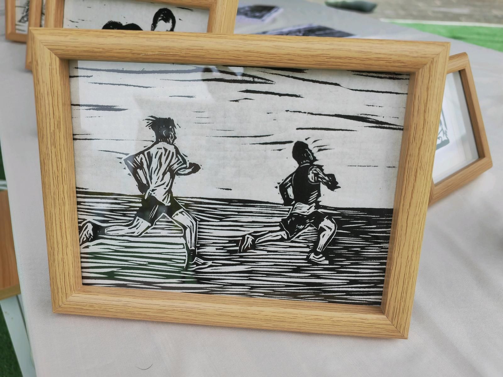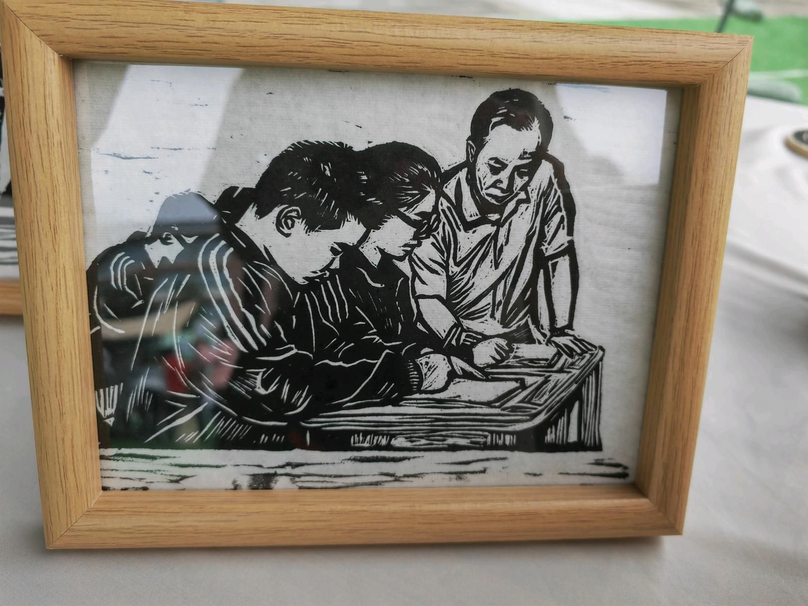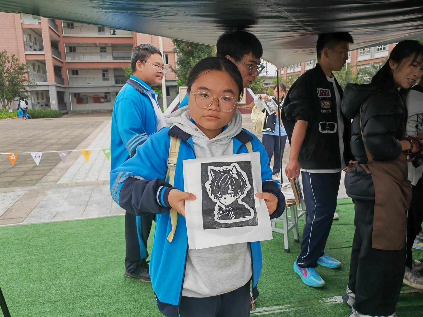 选一幅喜欢的木板图案,刷上油墨,盖上宣纸,按压拓印完成后再晾干,安上画框,短短几分钟,一幅栩栩如生的版画就完成了。11月11日上午,在文山市城南中学2025年文化科技体育艺术节上,旷野印记版画主题创意营地在中心广场开营,融艺术和体验于一体的版画实践活动,一开始便吸引了许多同学参与其中。